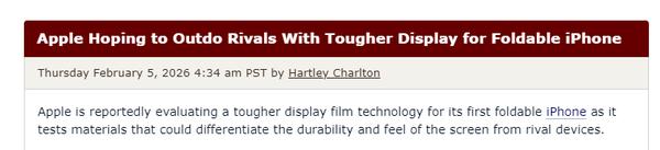 【CNMO科技消息】近日,CNMO注意到,最新爆料显示,苹果正为其首款折叠屏iPhone评估更坚韧的显示膜技术,旨在通过材料创新提升屏幕耐用性与触感,与竞争对手形成差异化优势。