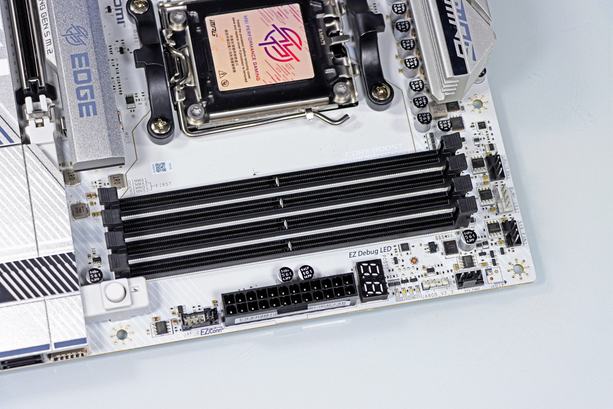 ▲ CPU 及 VRM 供电区域,这是整张主板最醒目的区域, VRM + I/O 盔甲令人一眼倾心。I/O 盔甲上有微星龙盾的 LOGO ,在通电之后可以呈现绚丽的 ARGB 视觉效果。