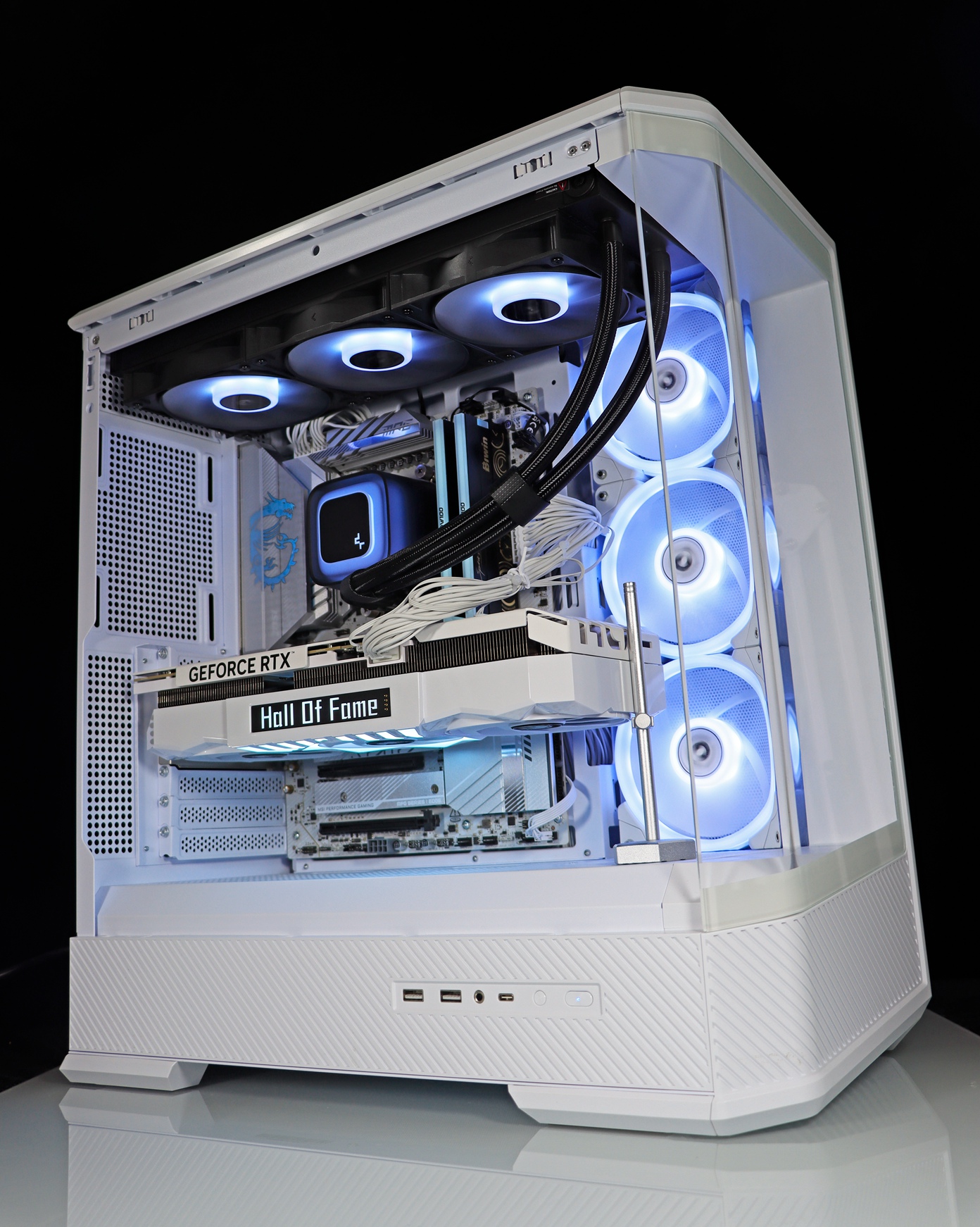 ▲ 主板除水冷散热器与内存外,整体都采用白色配件。灯光也特别的调成了白青色,让整机更加特别,我们也许就需要这样,在浮华的生活背后,需要这种洗尽铅华,让人静下来的力量。