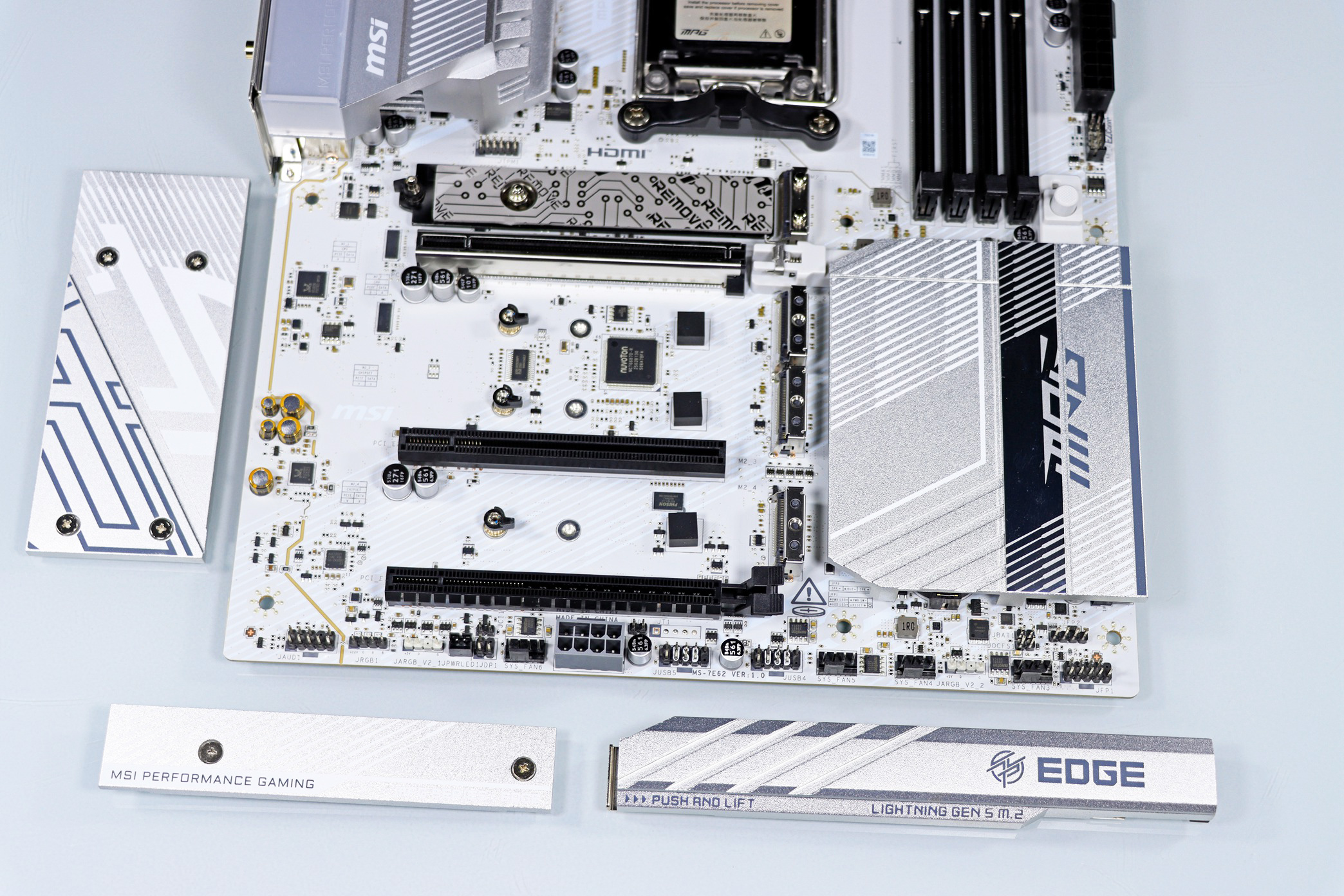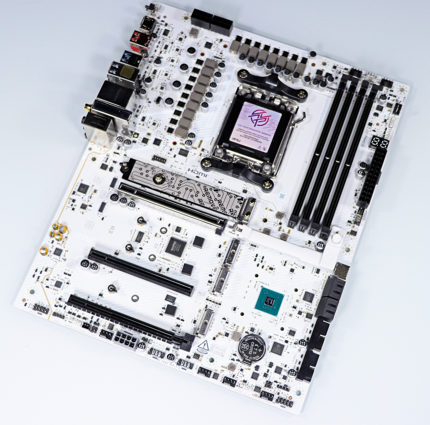 PCH 散热片十分厚实,它除了可以为 PCH 散热之外,底下还藏着主板的纽扣电池,微星这样设计可以让主板更加安全,防止小孩子抠出电池吞服。