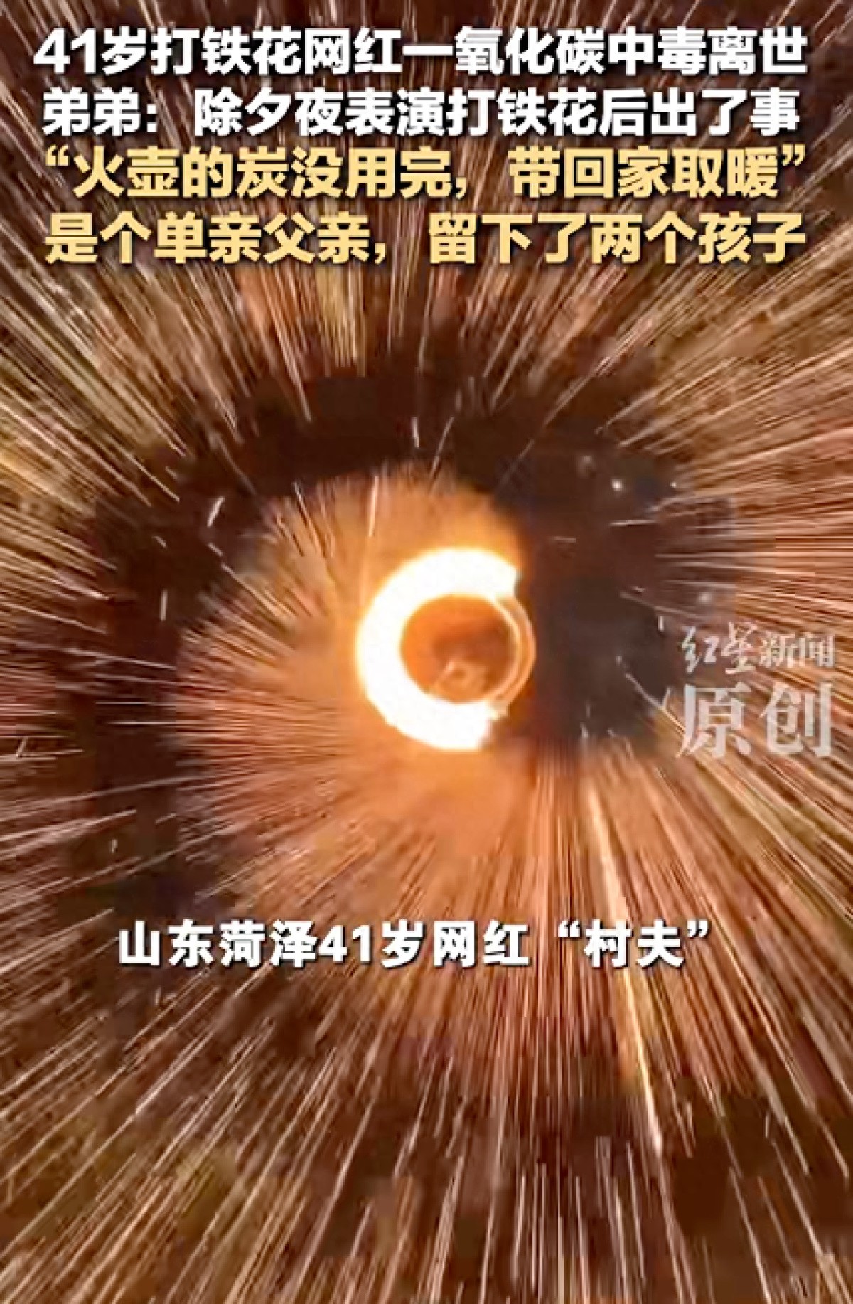 据红星新闻报道,记者从逝者家属处获悉,山东菏泽41岁打铁花网红“村夫”,除夕夜打铁花后把剩下的炭带回家取暖,不幸一氧化碳中毒离世。