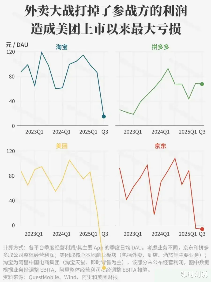 11 月份,美团、阿里、京东三大即时零售巨头相继发布 2025 年三季度财报,集体呈现 “增收不增利” 的承压态势,核心原因源于行业补贴战与履约投入的集中消耗。具体来看,美团三季度经调整净亏损 160 亿元,核心本地商业板块首次由盈转亏,亏损额达 141 亿元,销售及营销开支同比激增 90.9%;阿里同期经营利润同比暴跌 85%,尽管即时零售收入增长 60% 至 229 亿元,但销售和市场费用翻倍至 665 亿元,后续不得不宣布收缩闪购业务投入;京东包含外卖在内的新业务单季亏损扩大至 157.36 亿元,同比增幅超 25 倍,营销开支同比翻番至 211 亿元。三大巨头在二、三季度合计投入超800亿元争夺市场份额,虽成功推动订单规模与用户数量增长,但盈利端持续承压,这也标志着行业竞争已从 “规模扩张” 阶段正式转向 “效率优化” 的新阶段。