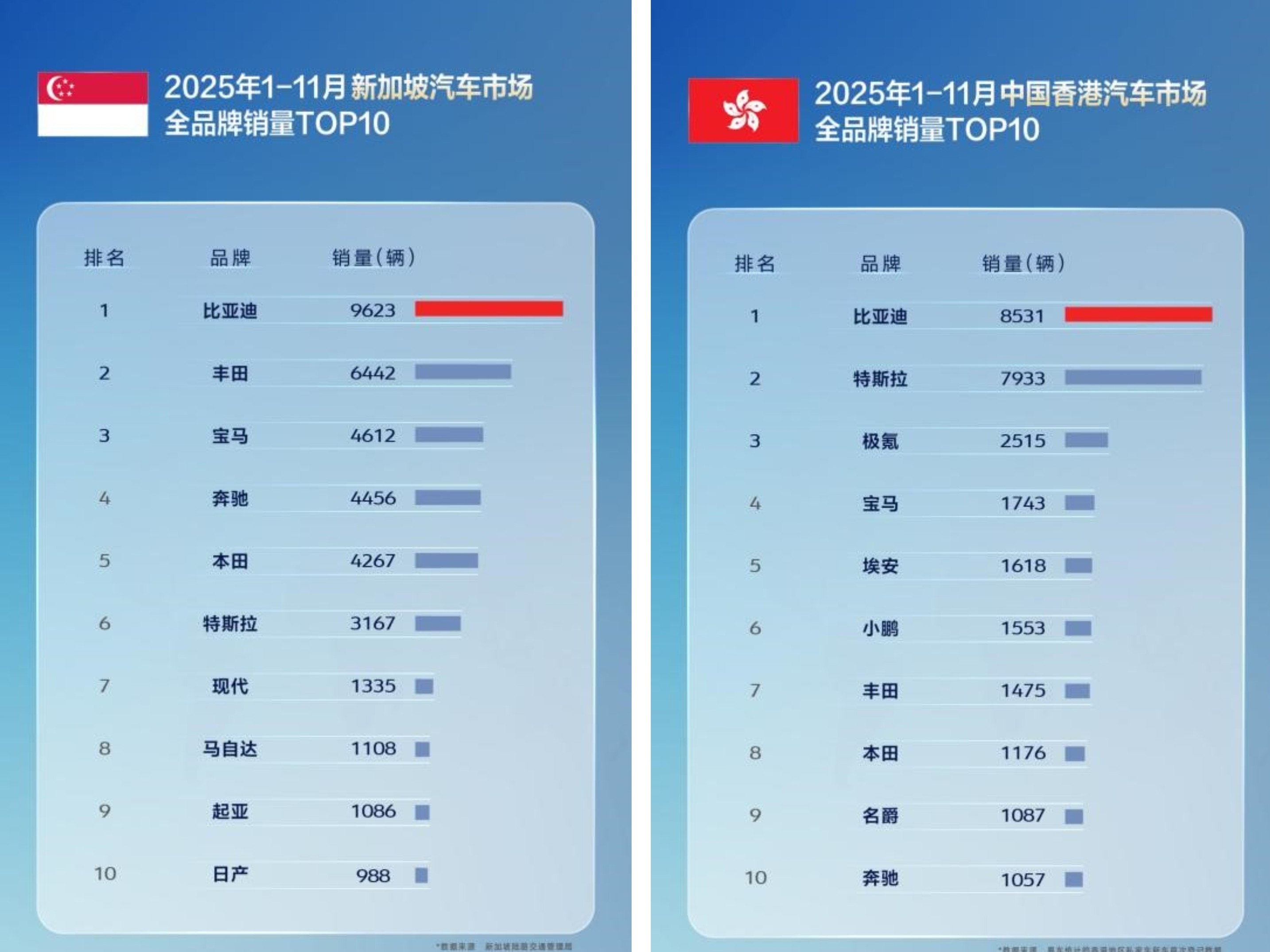 2025年1-11月,比亚迪在英国、德国、意大利、西班牙、奥地利、爱尔兰、马来西亚、土耳其、新加坡、泰国、中国等11个汽车核心国家市场,销量已经全面超越特斯拉。凭借多元化产品矩阵,比亚迪精准契合了全球不同市场消费者的差异化需求。同时,通过推进自建滚装船、本地化生产、构建完善的服务体系等一系列协同举措,为其海外拓展提供了坚实支撑。在这些出海策略的有力推动下,比亚迪出海狂飙全球领跑。