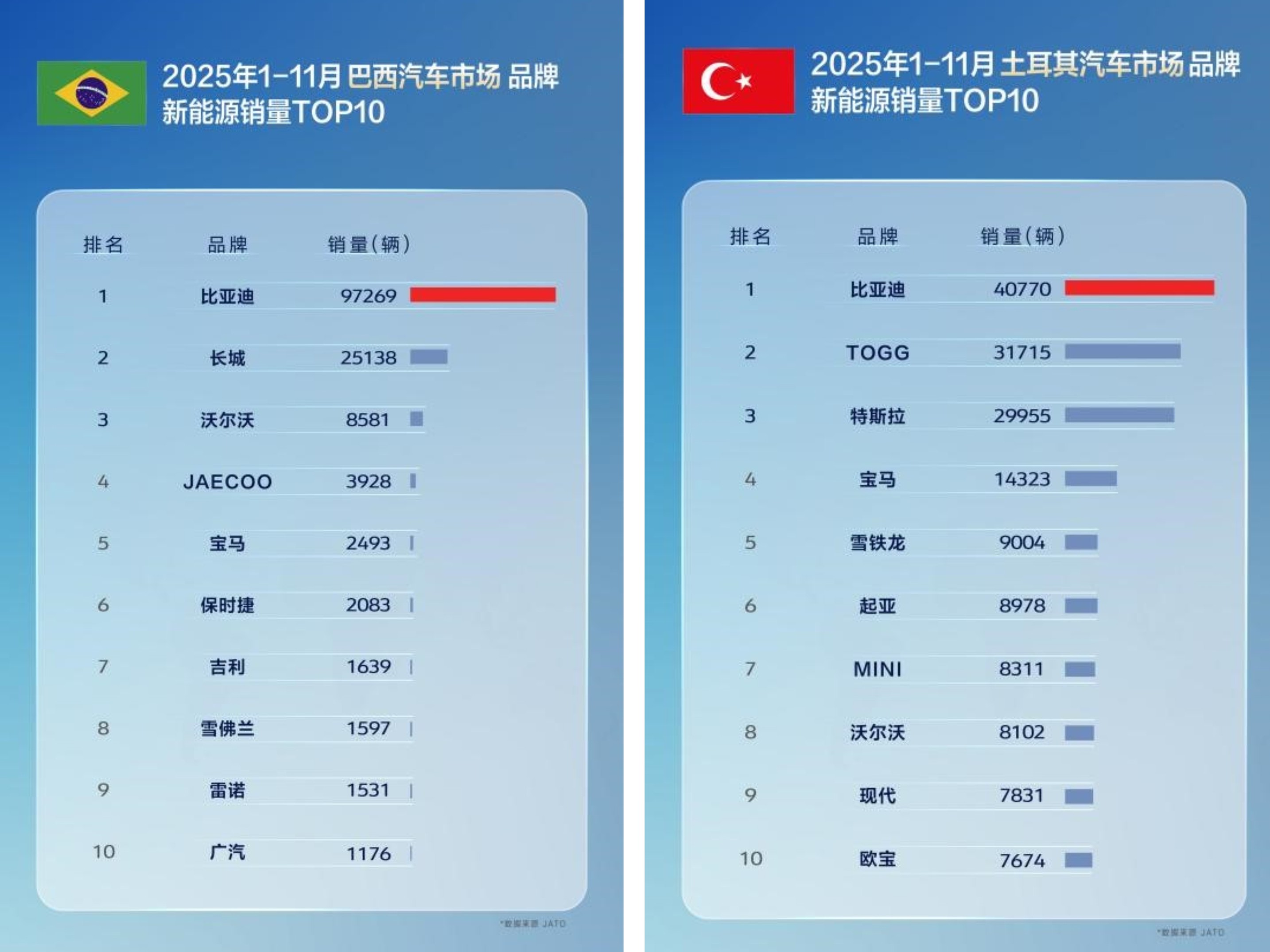 11月,比亚迪在巴西、土耳其、意大利、西班牙、匈牙利、克罗地亚等国拿下了新能源汽车销量第一,在新加坡等国家获得全品牌销冠。1-11月累计表现同样不俗,在巴西、土耳其、西班牙、意大利等国,比亚迪位列新能源汽车品牌销量榜首;在新加坡、中国香港等地区市场荣膺全品牌销量第一,备受消费者认可。