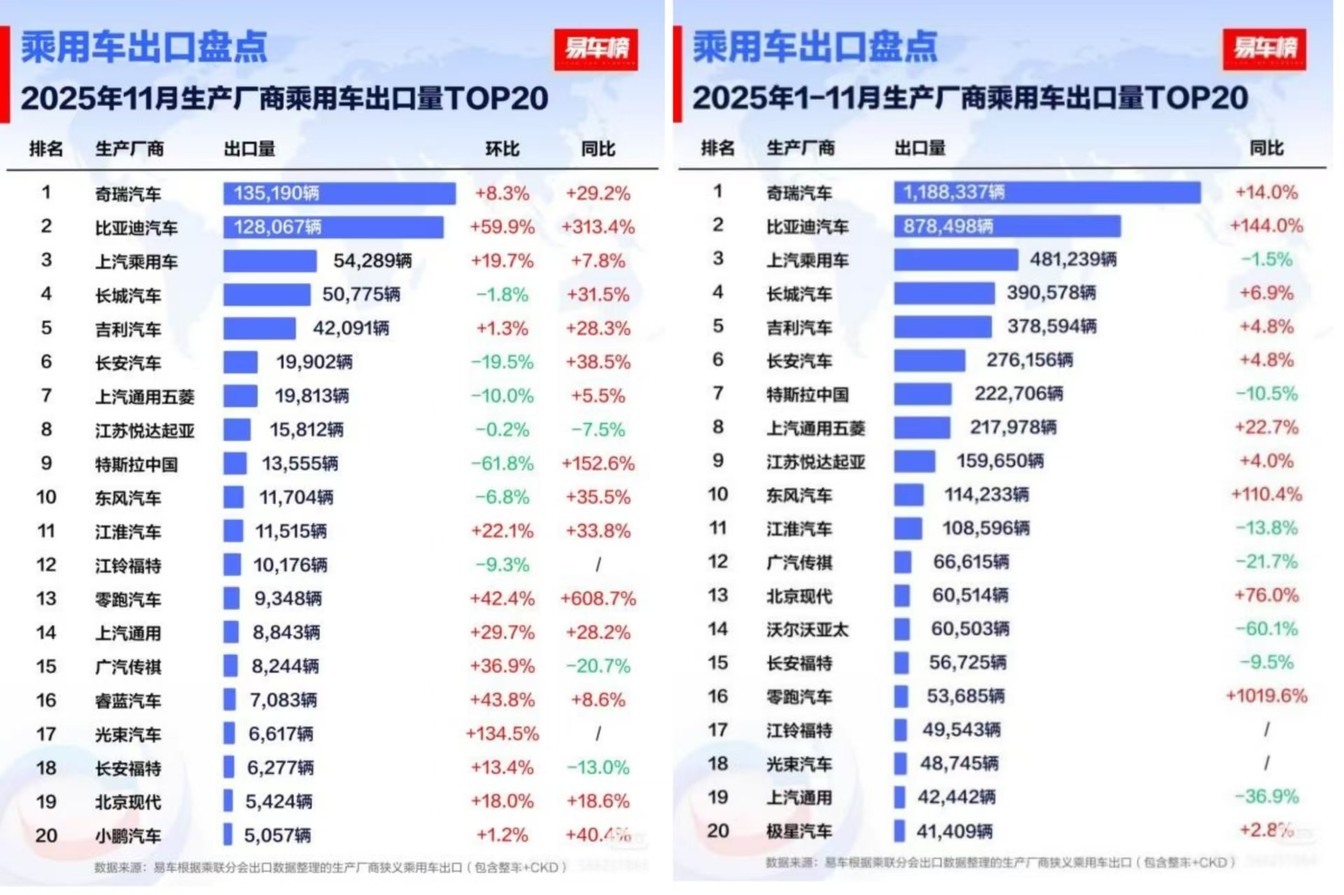 据易车数据显示,2025年11月,比亚迪乘用车出口量达到12.8万台,同比增长313.4%;今年1-11月累计出口87.8万台,同比增长144%,较2024全年总出口量已实现翻倍式增长,比亚迪成为中国出口增速最快的车企之一。