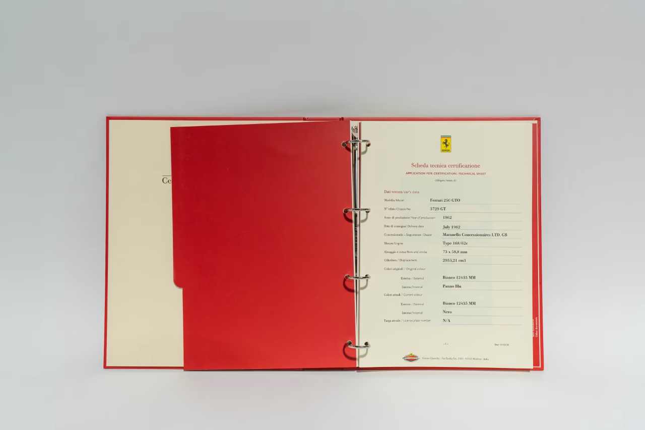 此后,它成为全球顶级经典车盛会的常客,频频亮相圆石滩车展、卡瓦利诺经典赛、古德伍德复古赛等重磅场合,每一次登场都能引发全场瞩目。更难得的是,它拥有法拉利经典车部门认证的红皮书,明确标注其近乎100%的原厂状态,从未经过侵入式翻新,所有核心部件、赛场改装细节均完好保留,这份极致原厂性,在历经六十余年岁月的250 GTO中,堪称凤毛麟角。