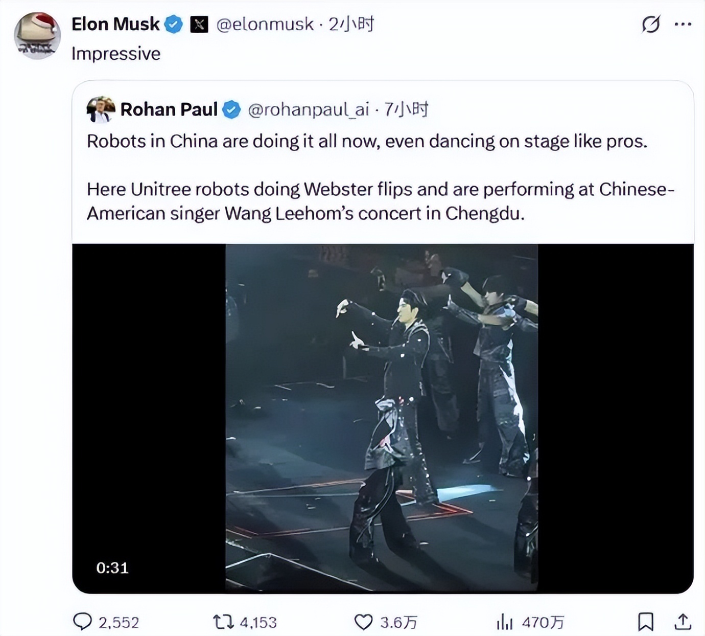 他在 X 平台上也瞅见了宇树机器人们的后空翻,不仅给了一个大大的赞,还配上"Impressive"(令人印象深刻)的评论,拉上海外 4000 万吃瓜群众一起看戏。