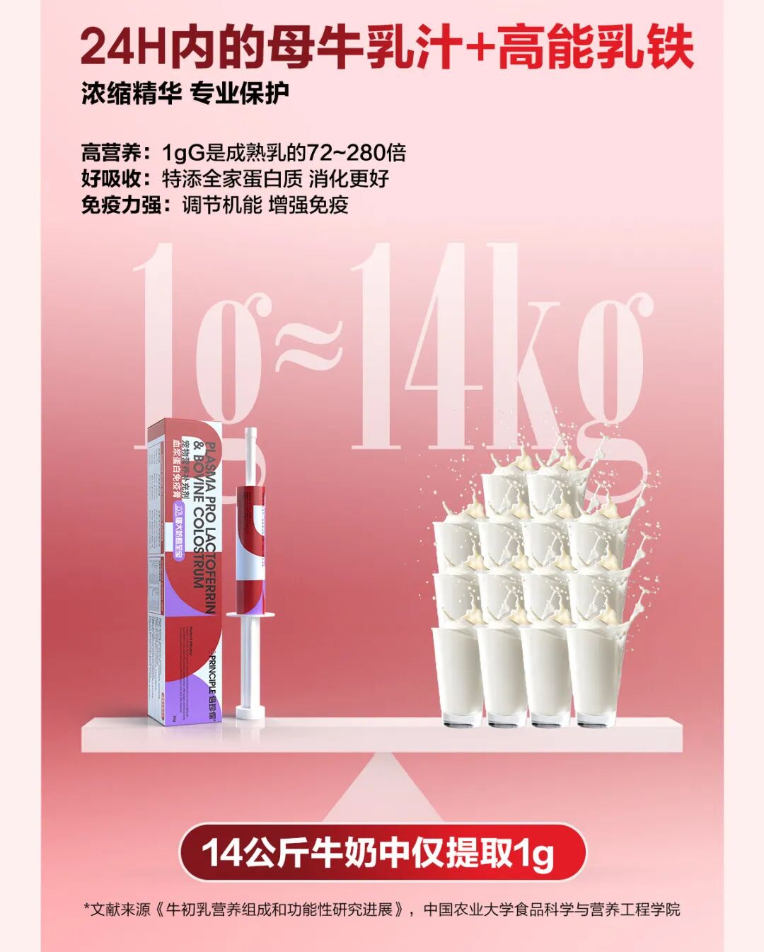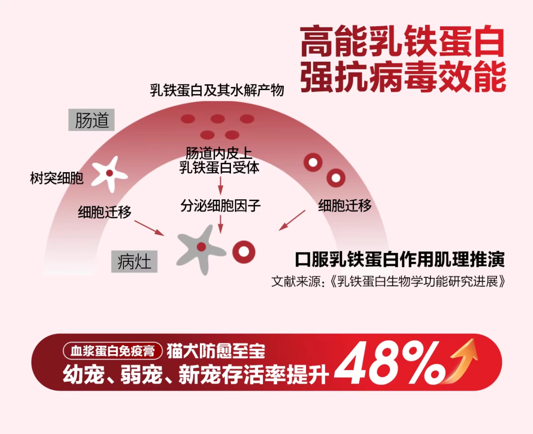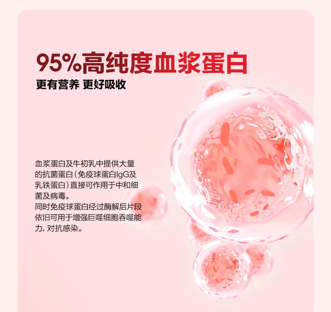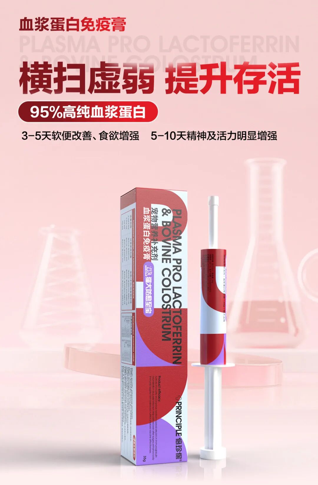 这款产品核心原料为95%高纯血浆蛋白,这种从24小时内母牛初乳中提取的珍贵成分,14公斤牛奶仅能提取1g,其免疫球蛋白含量是成熟乳的72-280倍。搭配4.0代后生元与乳铁蛋白,形成三重免疫防护体系,不仅能直接中和细菌病毒,还能通过酶解后的免疫球蛋白片段增强巨噬细胞吞噬能力,从根源提升宠物自身抵抗力。