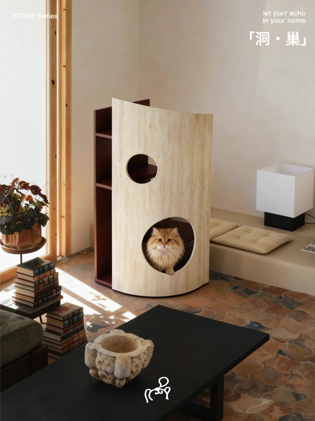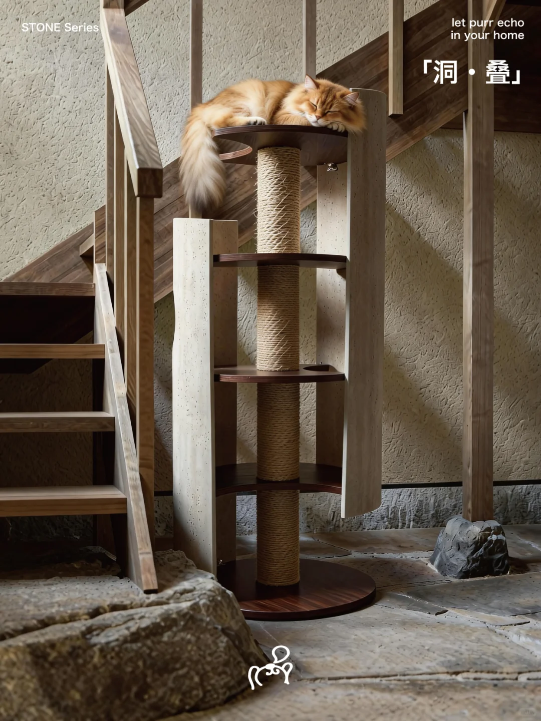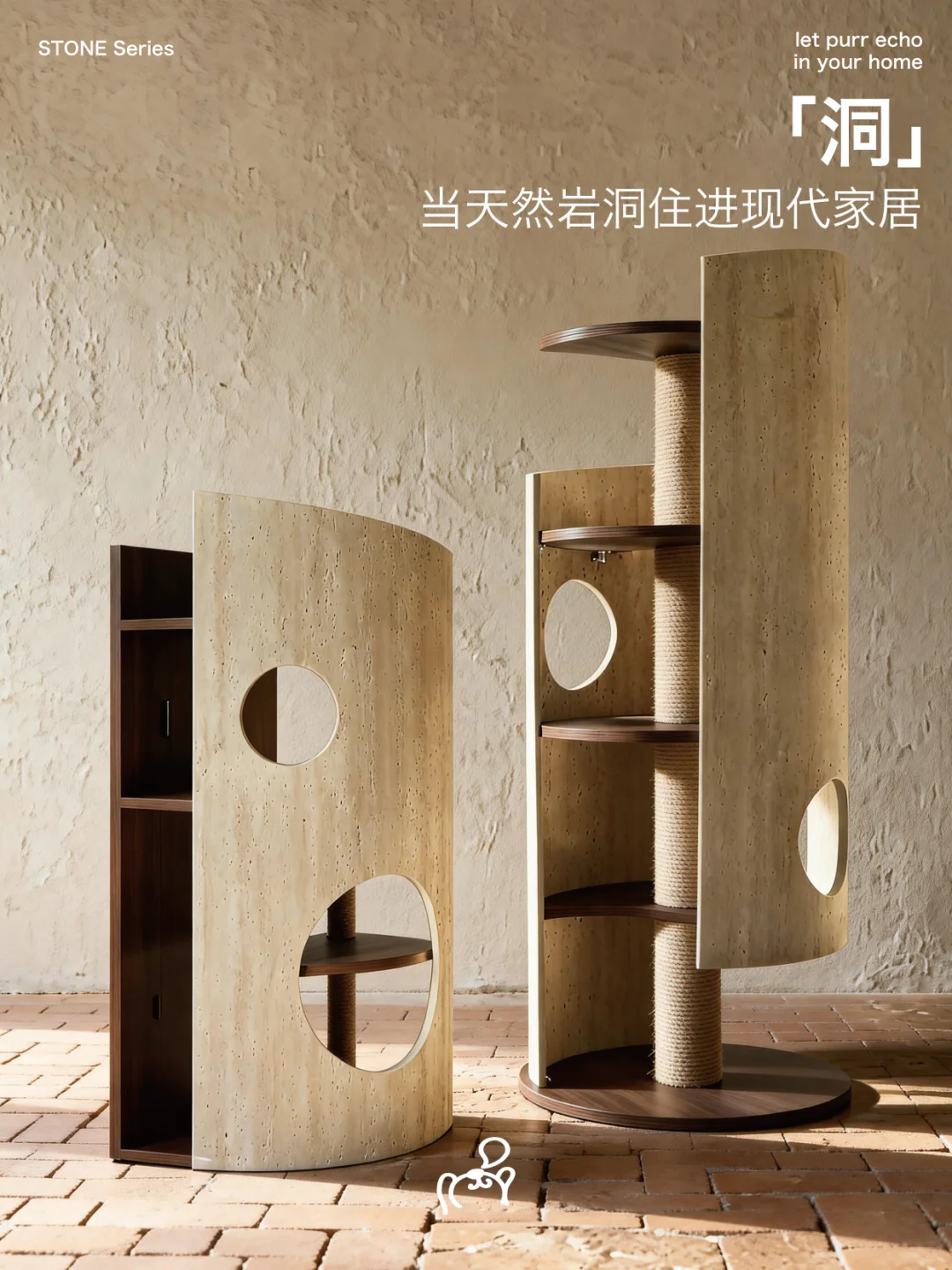 Purrlu此次以洞石元素为材质灵感的猫爬架新品,正是这一趋势的具象体现。这款产品摒弃了宠物用品固有的标签,采用低饱和色调、天然肌理材质,以简约线条与垂直结构设计,平衡宠物功能需求与主人审美需求,将宠物用品从实用工具重新定义为家居软装的延伸。这种设计将更好地融合进改善型居家空间里,精准契合当下高消费力家庭的审美需求。