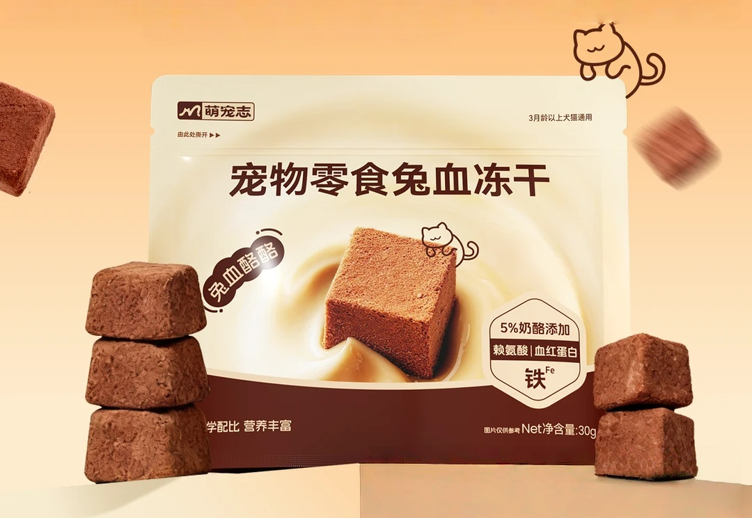 在众多新品中,我们以萌宠志兔血酪酪为代表,看看补血冻干类产品的食补新思路。这款产品主打“日常补血+零食属性”萌宠志兔血酪酪,以65%高浓兔血粉为核心配方,其余配料包括20%的冻鸡胸肉以及各占5%的冻鸡肝、冻鸡心与奶酪。