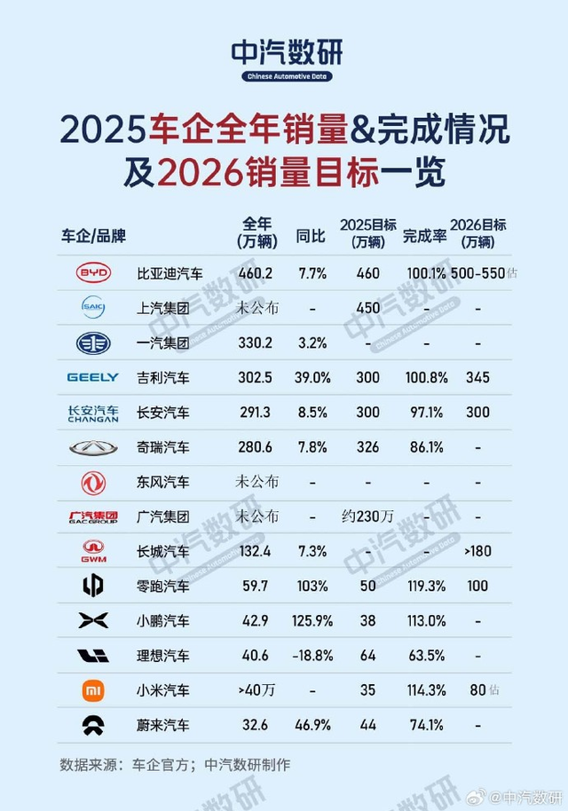 2025年的销量榜单,是行业格局重塑最直观的晴雨表。在中汽数研的一份2025年车企销量排名中,比亚迪以460.2万辆的绝对优势登顶,上汽、一汽分列二三位,而蔚来在该榜单中以32.6万辆位居末位。