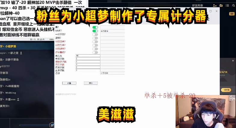 而国服第一上单最牛的地方,自然就是当他遇到了问题之后,很快就有一名非常喜欢小超梦的观众,专门为他制作了一个用来计算得分的小程序,目的就是为了让小超梦用更快的速度完成挑战,毕竟长时间不眠不休的高强度Rank,对小超梦的竞技状态,肯定会产生很大的影响。