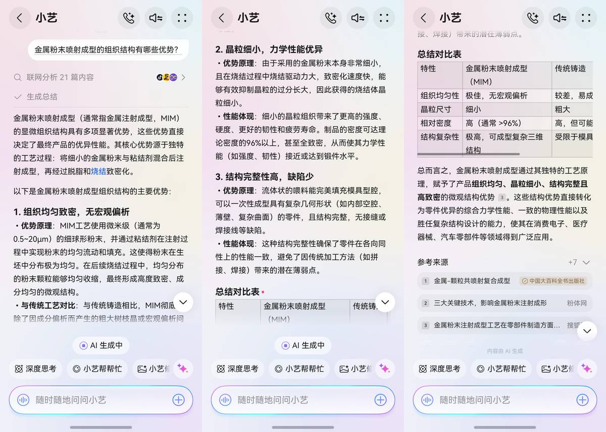我的课题是研究高强铝粉末喷射成型的相关应用,但金属粉末喷射成型的组织结构和工艺特点的基础概念,我始终云里雾里。看到播客里王骁说可以让小艺给出解决方案,我就试着用手机上的小艺问答,直接语音问:“金属粉末喷射成型的组织结构有哪些优势?”TA很快就用清晰地分点列出了答案:组织均匀性极佳、晶粒细小、相对密度高、结构复杂性极高……还给了简单的含义解释。这比我漫无目的查知网可快多了,至少让我知道了该重点看哪些章节,和老师讨论时心里也踏实了不少。