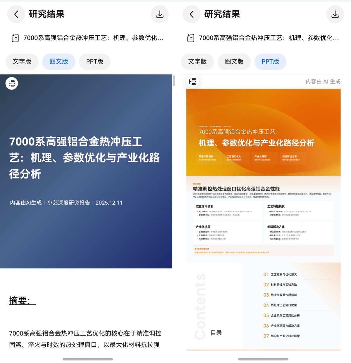 节目里,王骁也谈到小艺深度研究功能对调研很有帮助,这点我太有同感了!之前开题报告的“研究现状”和“技术路线”部分最让我头疼,完全不知道从哪写起。抱着试试看的心态,我用了用小艺的深度研究。我把粗略的题目“高强铝合金热冲压工艺参数优化研究”和几个关键词输了进去。点开始后,等了大约十五分钟,它就生成了一份结构清晰、内容详实的研究报告,从研究基础、核心机制,到微观组织、力学性能这些工艺特性差异,都写得十分详实。