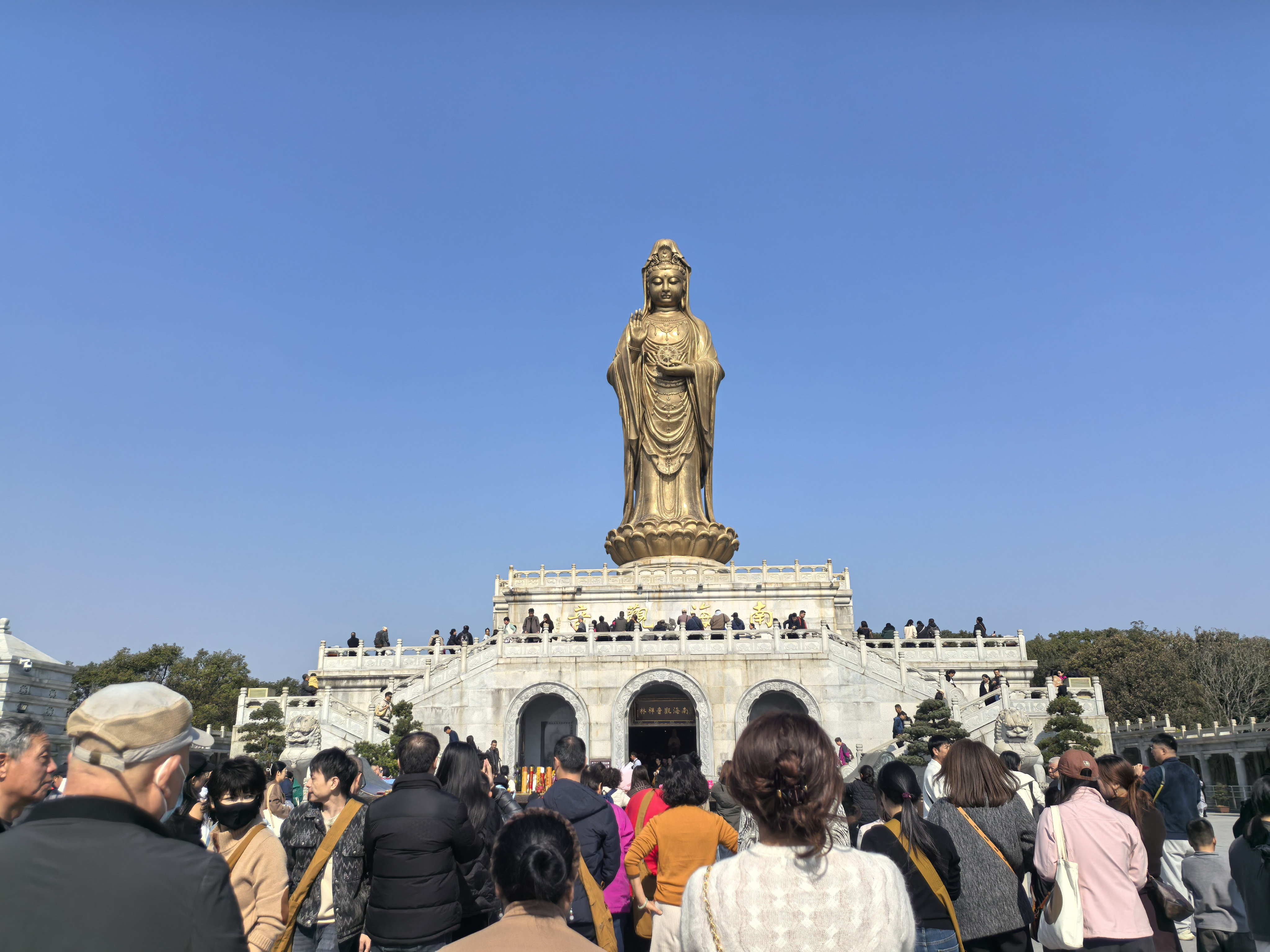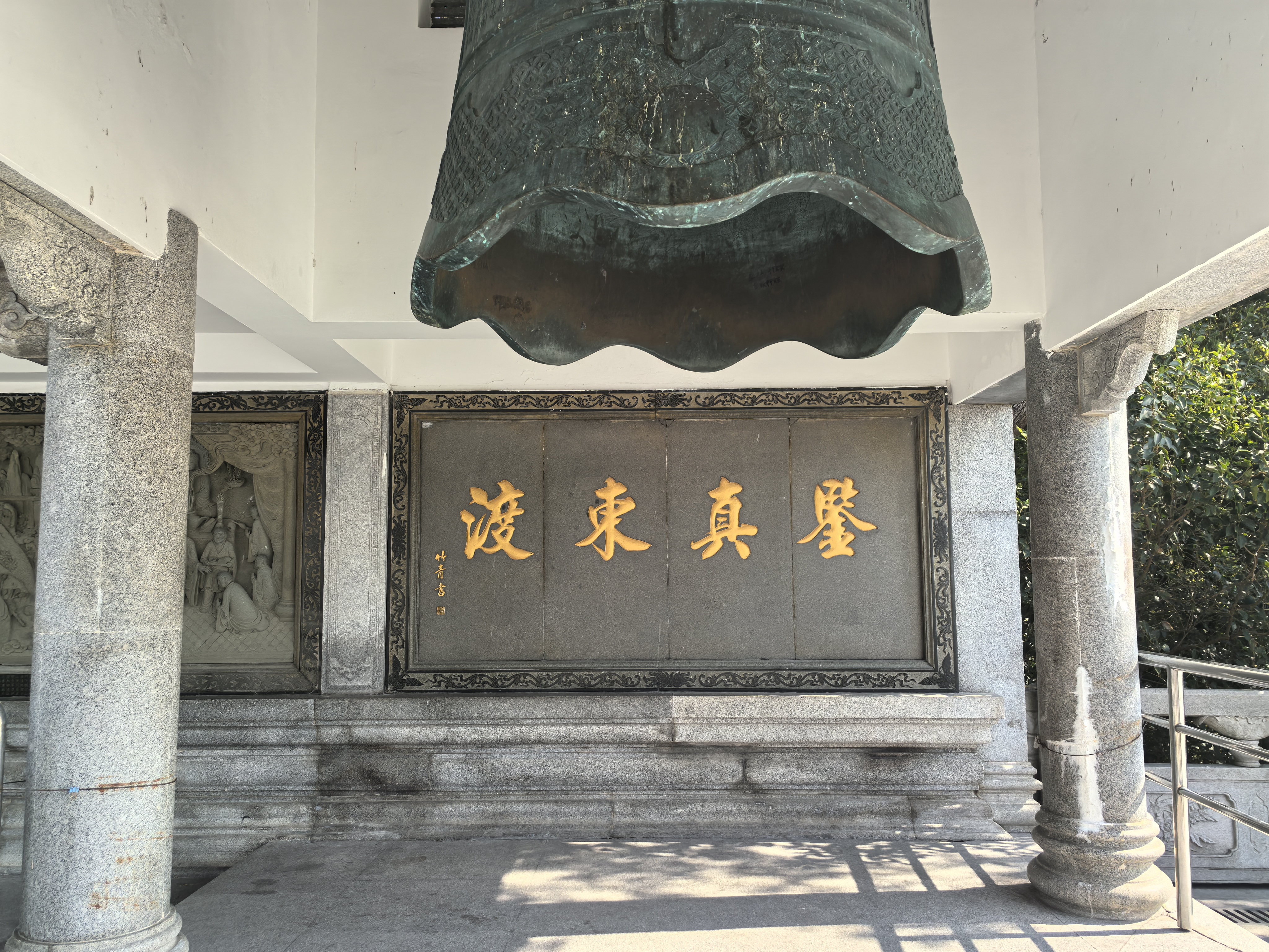 看到南海观音铜像了,南海观音高33米,面部使用了6公斤多黄金。我端详了半天,这南海观音的容貌确实本地化了,脸型很像华夏本地年轻女性,柔和中透着端庄。在边上又看到了鉴真东渡的大钟,自唐以来普陀山观音文化兴盛,普陀山实际成了韩国、日本,乃至东南亚的佛教文化交流中心。