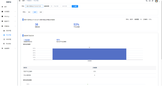 支持学生、班级、年级、每日作业及月度学科多维度图文学习报告,支持批量下载打印,含答题数、正确率等指标,涵盖能力、知识点分析及趋势对比。通过知识点趋势分析,学情追踪辅助教师精准教学。
