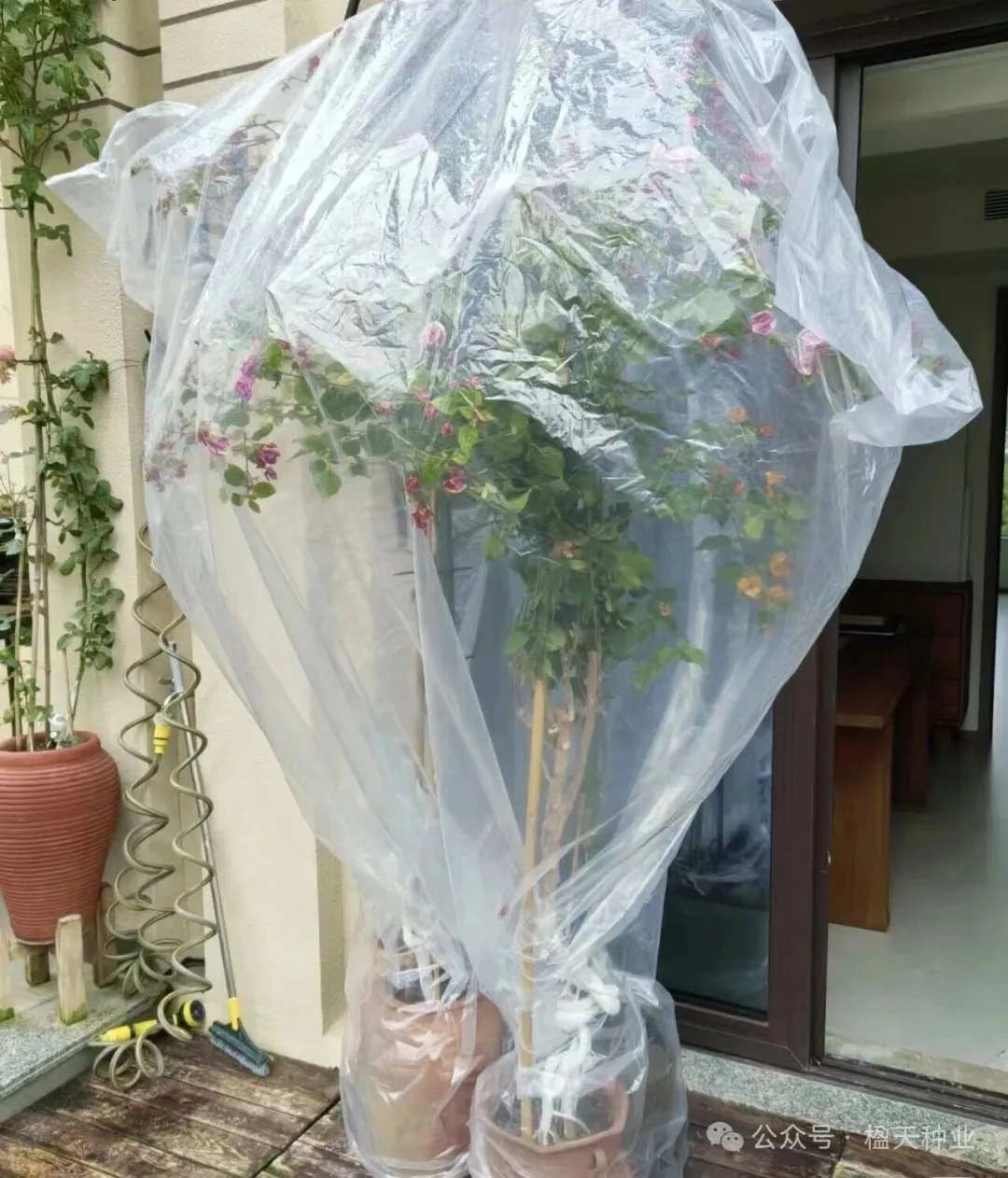 昨天网友发来照片,说养好几年的三角梅最近忘记移到室内了叶子都冻掉了,枝条都冻的催了,不知道这样还能不能活。说到这里大家长看我文章的应对都知道哈,上个月降温的时候就提醒大家了,尤其是新手朋友。向北方地区的朋友养的花很多都是南方的花,所以啊,要及时移到室内,不然春季很难开花的,更严重的就是直接冻死。向网友反馈的基本上是春天开不了花了。北方多地降温到零度以下,露台、院子里的南方品种花卉可不能再“硬扛”了!尤其这5种花,都是我们常见爱养的花,对温度特别敏感,轻则冻伤掉叶,重则整株冻死,次年基本上都不会开花。对不好移动无法进屋和棚子的,可以仿照下图这样操作。下面就这五种花个大家简单介绍一下,希望对新手朋友们有帮助。