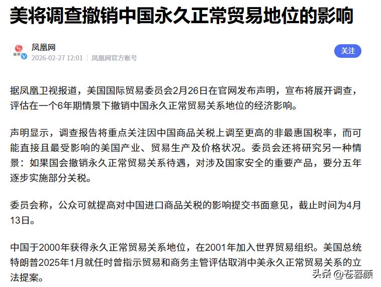 2026年2月26日,美国国际贸易委员会发布声明,启动对中国贸易地位的调查,调查指向的是2000年《对华永久正常贸易关系法案》确立的待遇安排。