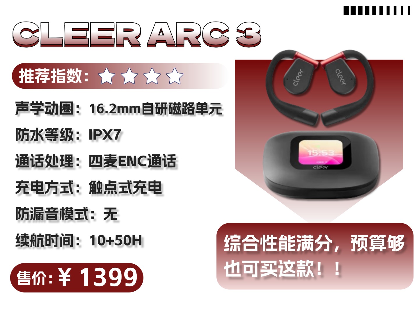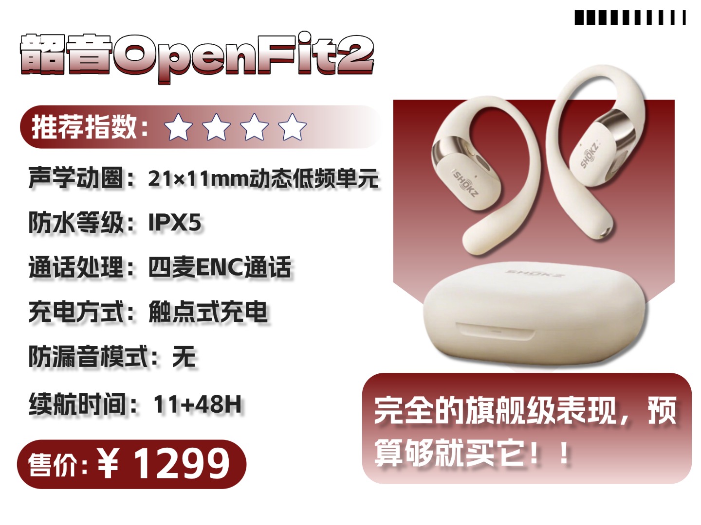 推荐理由:轻量型的入门级开放式耳机,,基础使用场景完全没问题。
