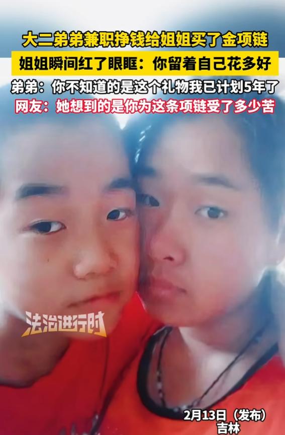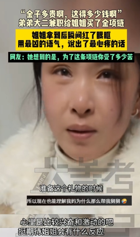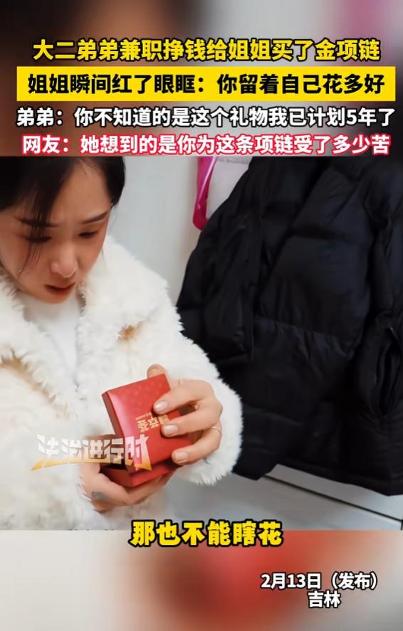 姐姐看到弟弟准备了5年兼职赚钱买的金项链后,瞬间红了眼眶,用最心疼的语气,说出了最心疼的话“金子多贵啊,这得多少钱啊,你留着自己花多好”。