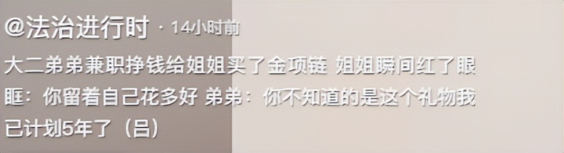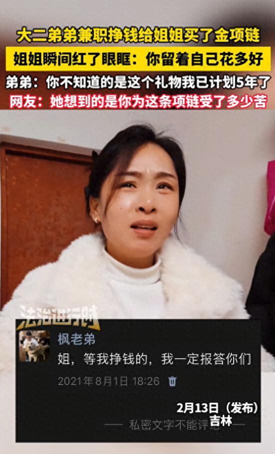 如今弟弟长大了,读大学了,懂事了,自己兼职去赚钱了,赚到钱就给姐姐买金项链。