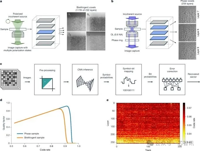 △Project Silica系统的读取与解码:a,使用偏振分辨显微镜进行双折射体素读出示意图;b、使用相差显微镜绘制的相位体素读出示意图;c、解码流水线,显示图像被解码为恢复扇区;d,LDPC曲线,展示了码率(水平轴)与质量因子(纵轴)在双折射和相位体素的权衡。e,恢复以相位体素编码的原始数据跨层(垂直轴)和轨道(水平轴)所需的编码率热图示例。数据显示,编码率主要取决于玻璃的深度,而非 xy 位置。