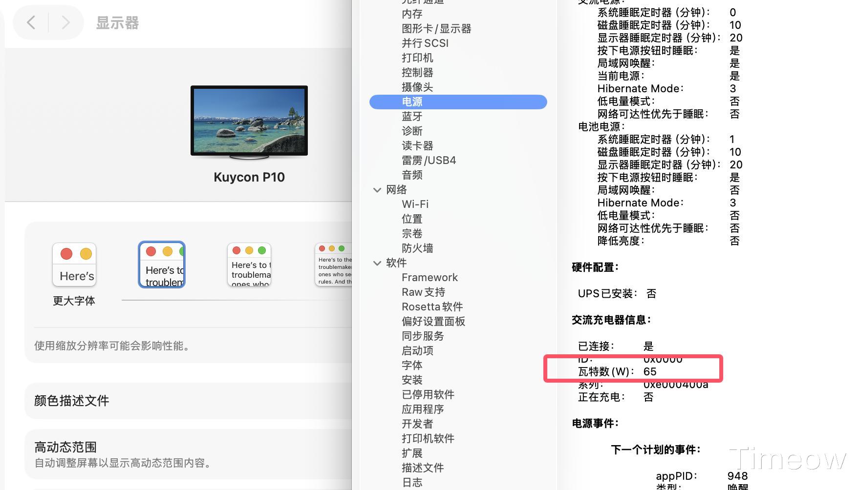 我用其随附的全功能Type-C线将显示器和笔记本连在一起后,不仅可以实现图像传输,还直接给我的MacBook笔记本充上电了,系统信息里显示是65W电源适配器,方便!