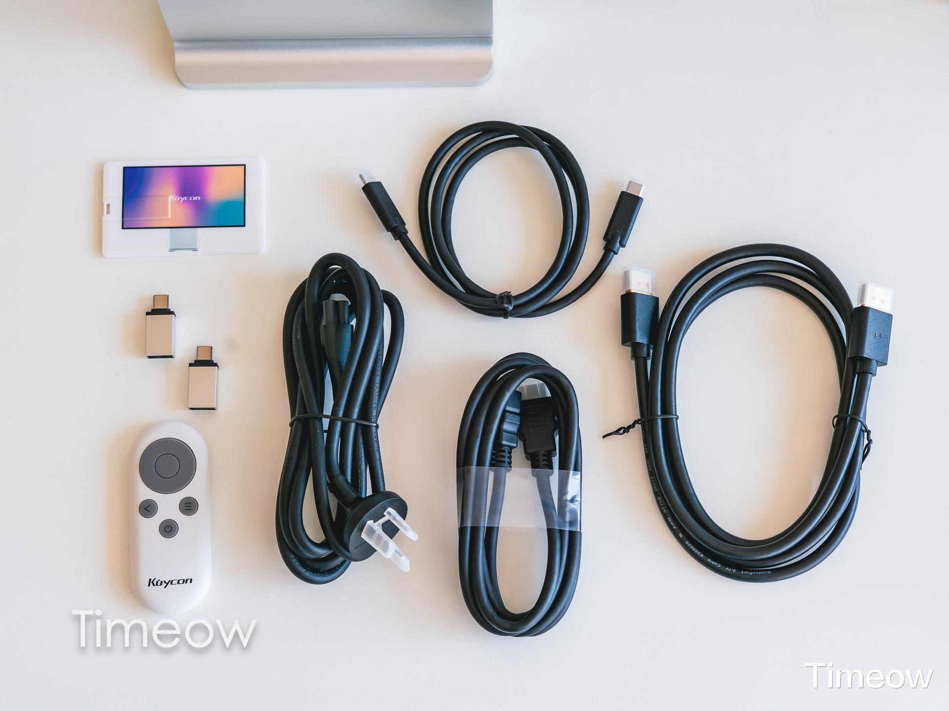 包含可以调节显示器的遥控器一个,DP、HDMI、全功能Type-C、电源线各一,还有C口转换器x2和装有说明书的USB2.0优盘,酷优客给的还是挺多的,而且都能用的上。