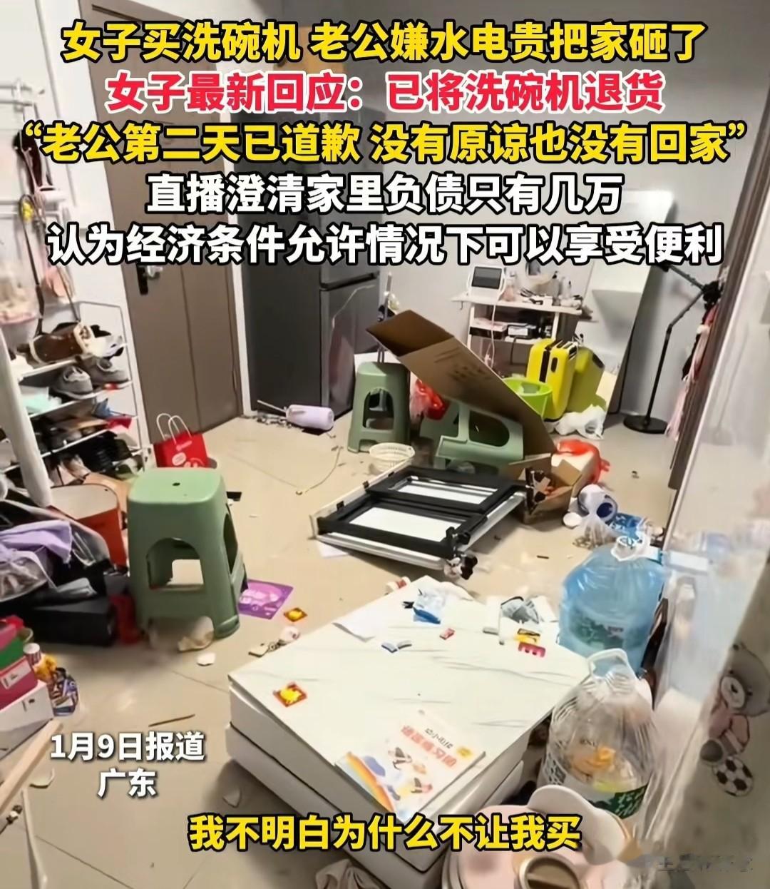1月7日,广东一对夫妻因为一个洗碗机闹得不可开交,妻子瞒着老公买了一台洗碗机,结果被老公愤怒指责,甚至当着安装工面将家砸了个稀巴烂,妻子一肚子委屈无处诉说,之后带着孩子离家住进了店。