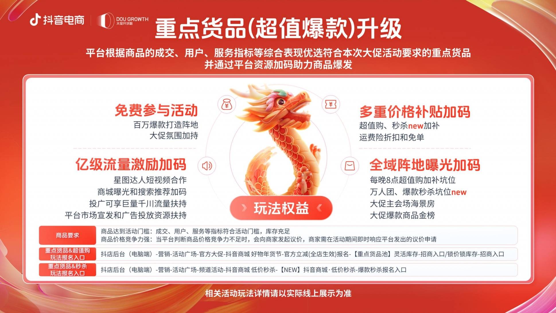 同时,抖音电商将根据大促活动前一定时间内单个商品的综合表现(包括但不限于成交、用户、服务等指标的考核),优选出销售力、价格力、品牌力、爆发力及质量等都较优异的「重点货品」(超值爆款),入选商家商品成功报名活动,则有机会在大促中享受专属的全网扶持政策,如免费参与活动、流量激励、补贴、曝光等,帮助好物实现“快准狠”打爆。