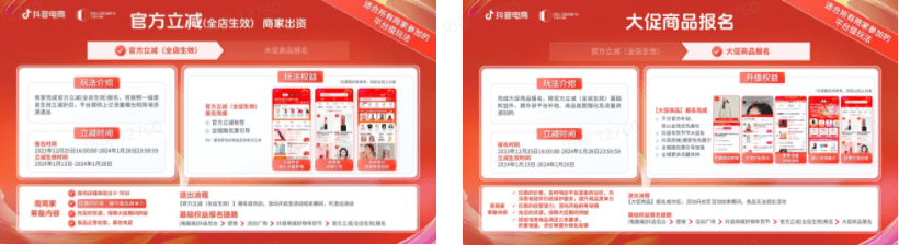 「官方立减」包括官方立减(全店生效)报名和大促商品报名,分两步给予商家专属资源扶持。商家完成官方立减报名,店铺商品则按照平台制定的类目固定折扣生效立减优惠,并可获得超亿级流量曝光。在此基础上完成大促商品报名,即可获得大促专属商品氛围以及额外资源加码。想参与这一玩法的商家,可通过电脑端进入抖店后台【营销】页面,在【活动广场】找到【抖音商城好物年货节】,点击【官方立减】报名。