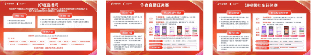 在内容场景,「抖音商城好物年货节」更加重视商家与达人间的联动,且针对各类型达人推出多样化玩法。如面对满足活动基础门槛的达人或商家推出「好物直播间」玩法,平台方提供运营扶持或货品补贴,助力大促期间冲刺交易目标,实现生意跃迁。此外还有「作者直播任务赛」、「短视频挂车任务赛」等,充分激活直播、短视频两大内容场景,借助达人种草让更多优价好物触达兴趣用户。