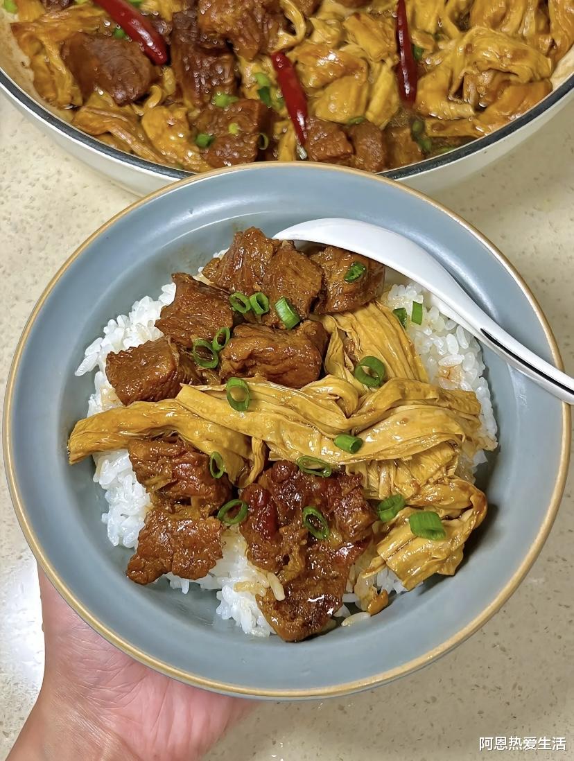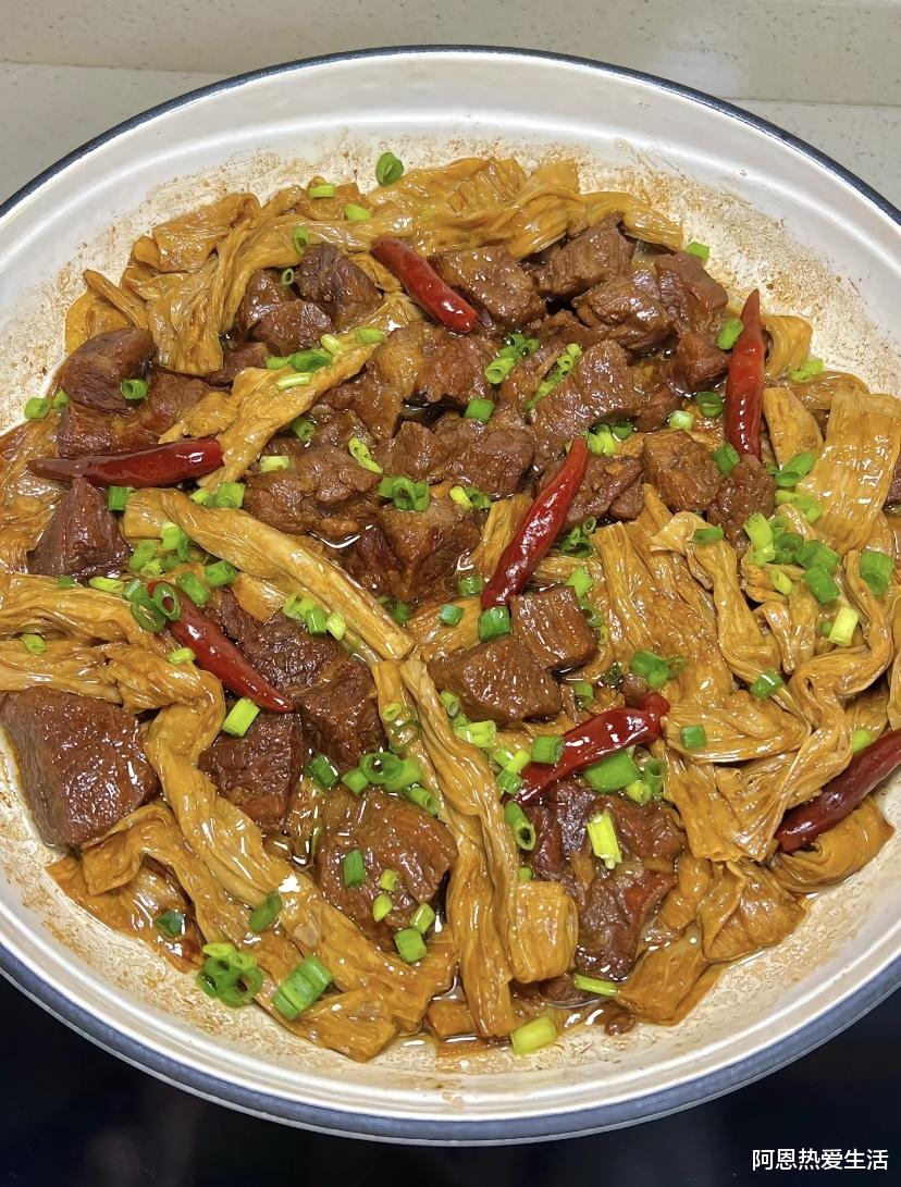 而牛肉,自古以来就是“硬菜”的代名词。当这“素中之荤”的腐竹,遇上了“肉中之王”的牛肉,简直是天作之合。腐竹像一块干渴的海绵,贪婪地吸饱了牛肉的油脂和酱汁,变得丰腴软糯;而牛肉则因为腐竹吸走了多余的油腻,变得清爽不腻。这哪里是做饭?分明是让两种食材在锅里互相成就,谈了一场“双向奔赴”的恋爱。