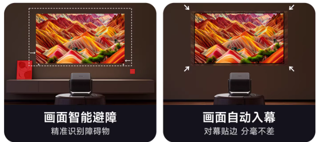 两款投影仪都具备智能避障和自动入幕功能,这两个功能大幅提升了投影的便利性。智能避障功能的原理是通过投影仪的传感器发射光线,探测前方的障碍物,当检测到有障碍物时,投影画面会自动避开障碍物,确保画面的完整性。