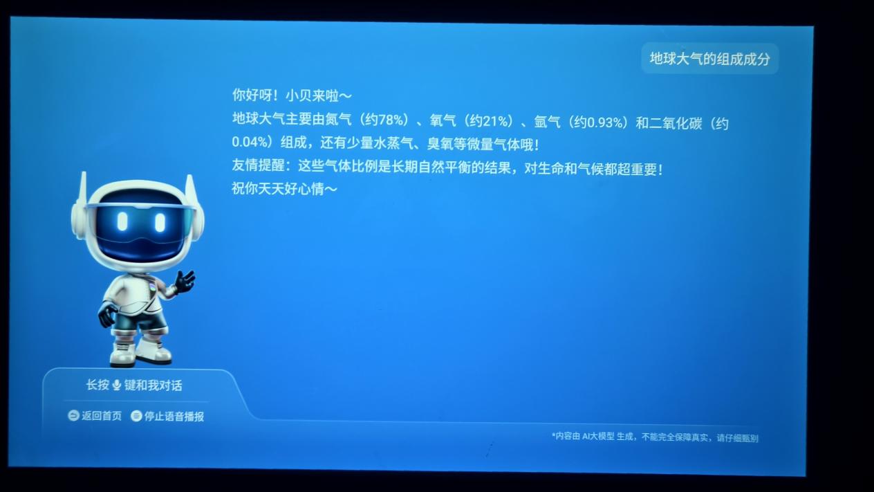 当贝超级AI OS系统提供了各种AI功能,比如进入AI模式后,可以通过遥控器上的麦克风按键与AI智能体直接对话,询问问题、让其查找资料或者打开某个APP。