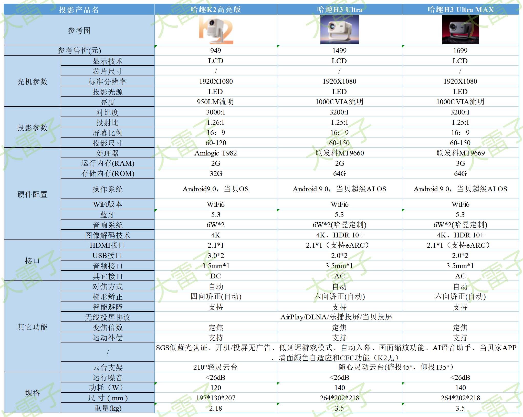 ①这个价位采用DLP技术的投影仪,亮度只有哈趣这两台的一半甚至更低,即便采用三色激光的竞品,实际亮度也只是和哈趣H3 Ultra和MAX相当。