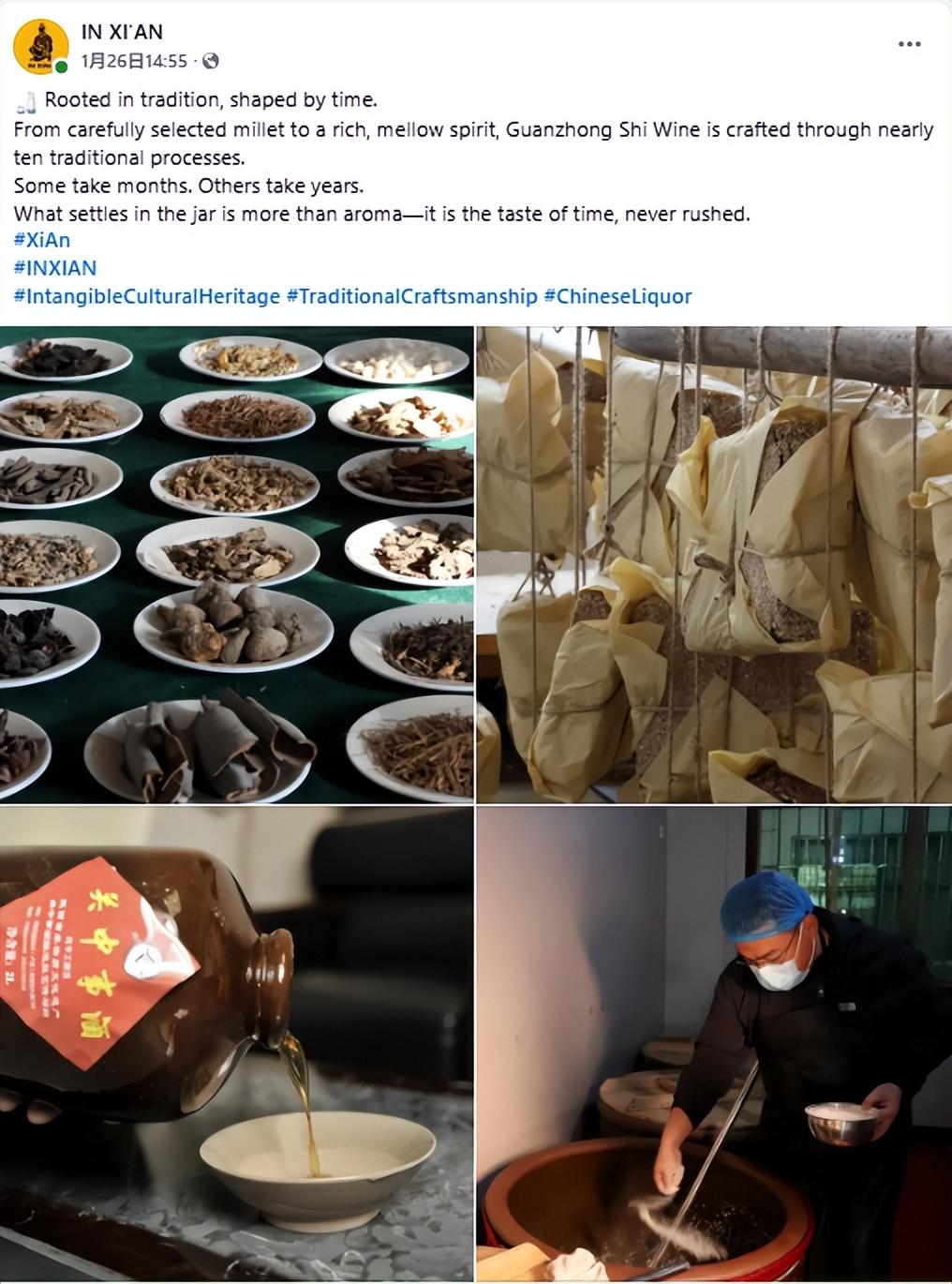 IN XI’AN在Facebook、Instagram和X平台发布关中事酒主题图文内容,通过多组制作细节画面展现这一传统酒品从原料甄选到长期发酵的匠心工艺,向海外受众介绍关中地区延续数百年的传统酿造智慧。该帖文目前收获超4.1万浏览及3500+次互动。