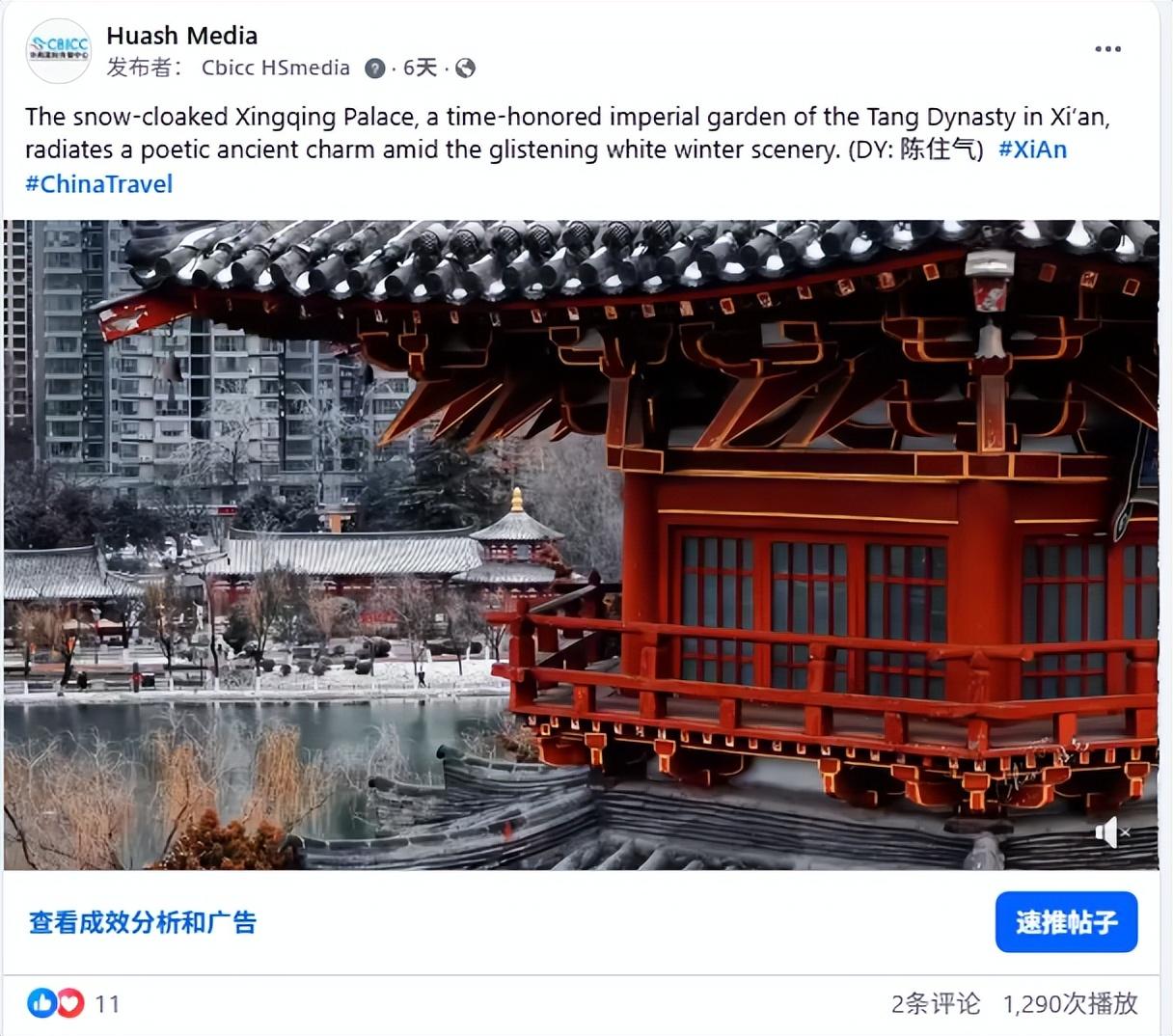 Huash Media发布兴庆宫公园冬日雪景的相关视频,展示西安冬日旅行魅力,相关帖文在Facebook平台获得1200+次浏览。