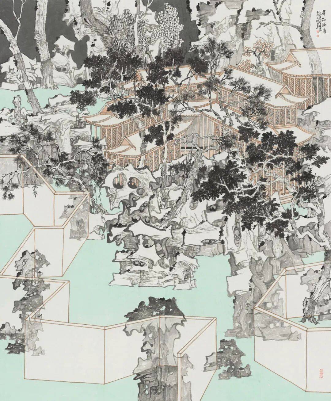 与传统文人园林画常见的避世情怀、隐逸格调不同,谢士强的作品暗含着当代人面对园林时的真实共情,在视觉呈现与身体体验层面消解了“古与今”的僵硬边界,着力呈现园林的当代性即时体验。他的画面中常有孤亭静立、似无人迹,却可透过花窗漏景隐约瞥见远处现代建筑的一角;或以明亮清透的色彩晕染枝叶,打破传统水墨过于内敛的淡雅调性,对应着当代人游览园林时的双重心境——既沉浸于古典意境,又清醒感知园林与现代城市生活交织共生的现实。这种叙述方式,使园林的即时经验不再是对历史的怀旧式回望,而是当下的、鲜活可感的日常:是午后阳光洒落廊间的温暖,是风过竹林的细碎声响,是身处其中短暂脱离都市喧嚣的松弛与安宁。这些极具当代性的情绪与感受,都被他以笔墨细心定格,成为当代人理解与体验苏州园林的重要经验注脚。