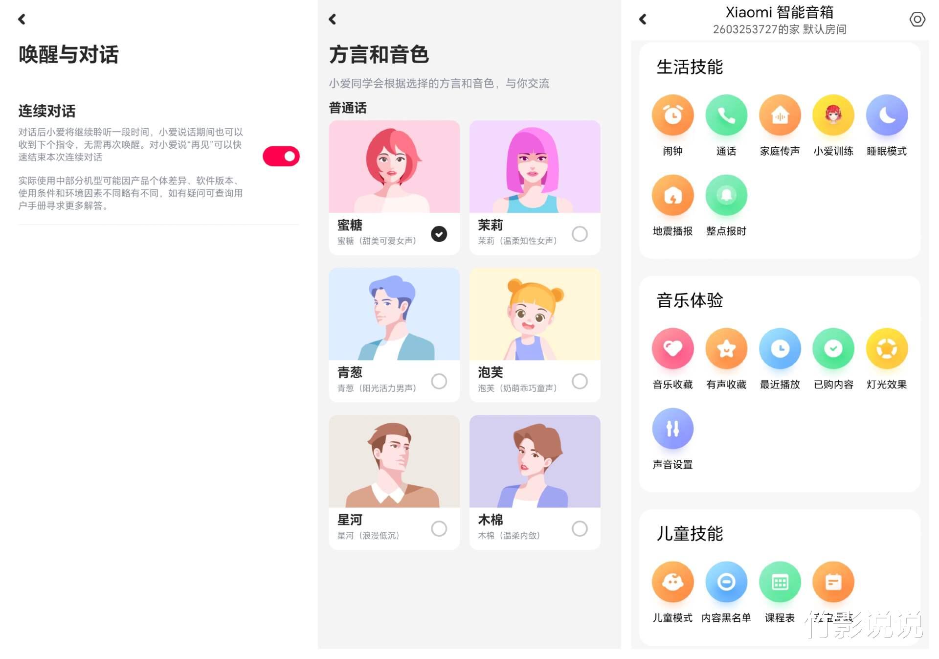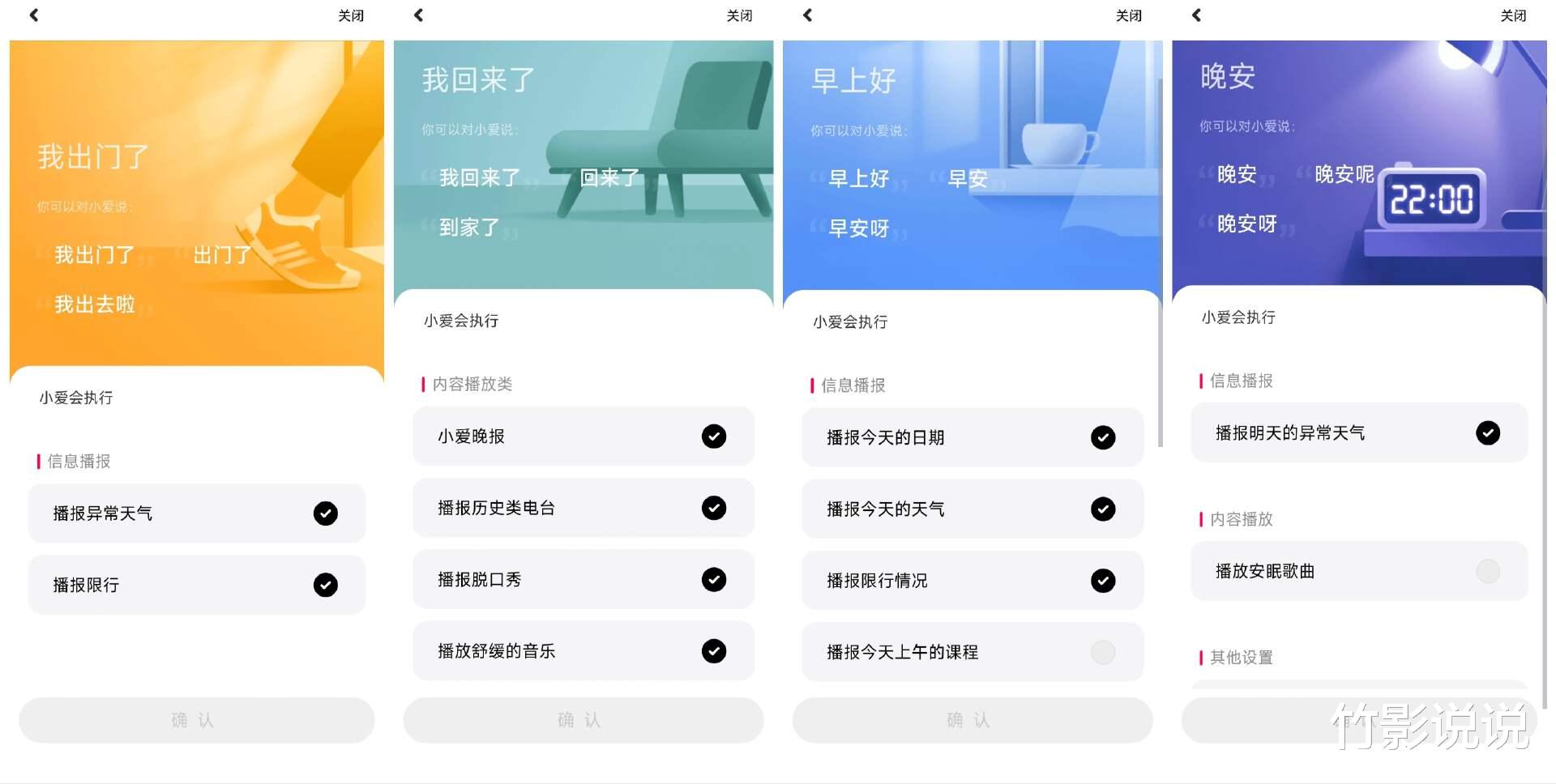 更让我深感满意的是,这款小米智能音箱还能自定义场景体验。比如我说“小爱同学,我出门了”,它就会自动关闭灯光空调、播报异常天气和限行情况等,已经“小爱同学,我回来了”,瞬间就能开启全屋灯光、播报小爱晚报、舒缓音乐等等。晚上睡觉时一句“晚安”,就会关闭各种电器、播报明天异常天气、播放安眠歌曲等,使用起来特别省心。