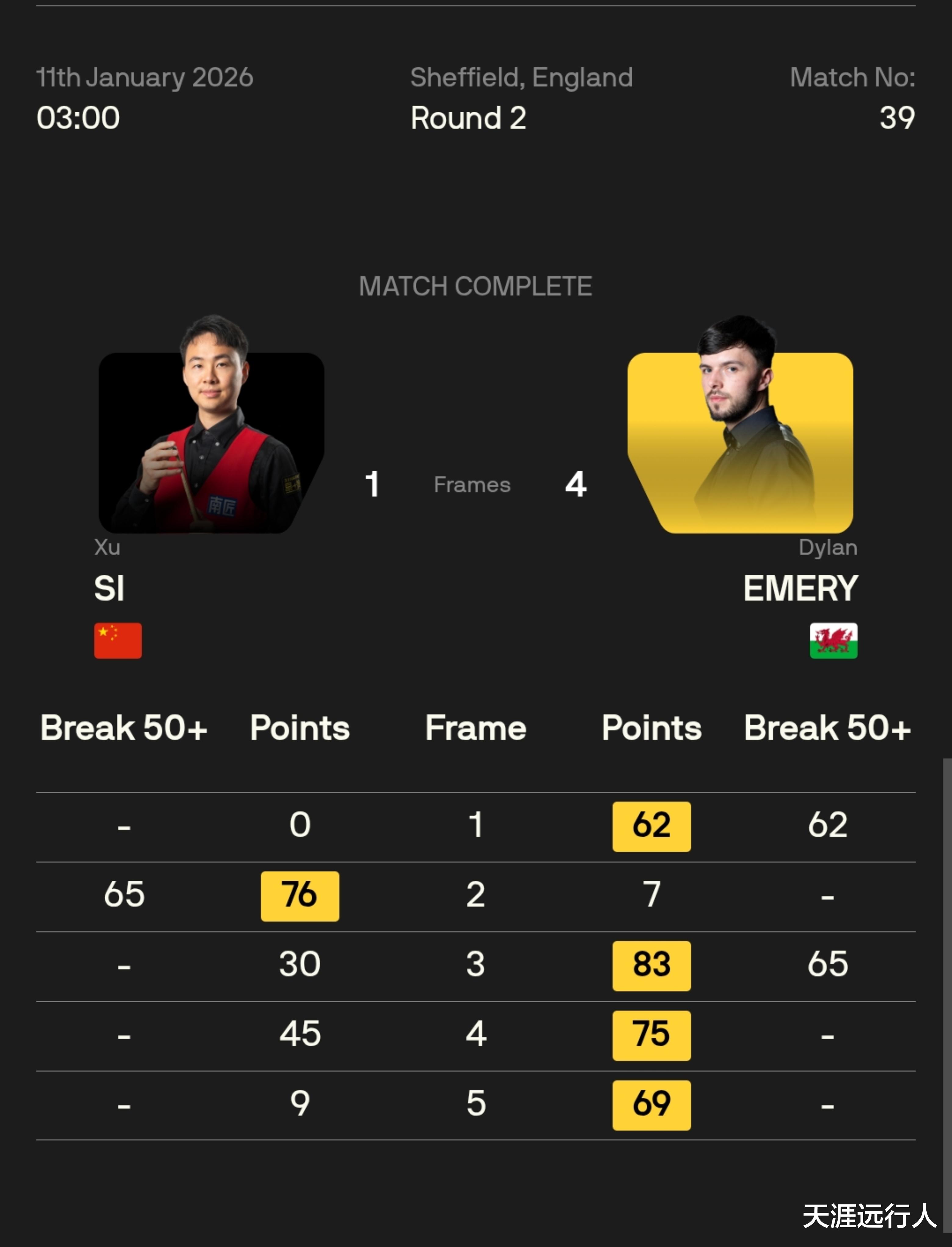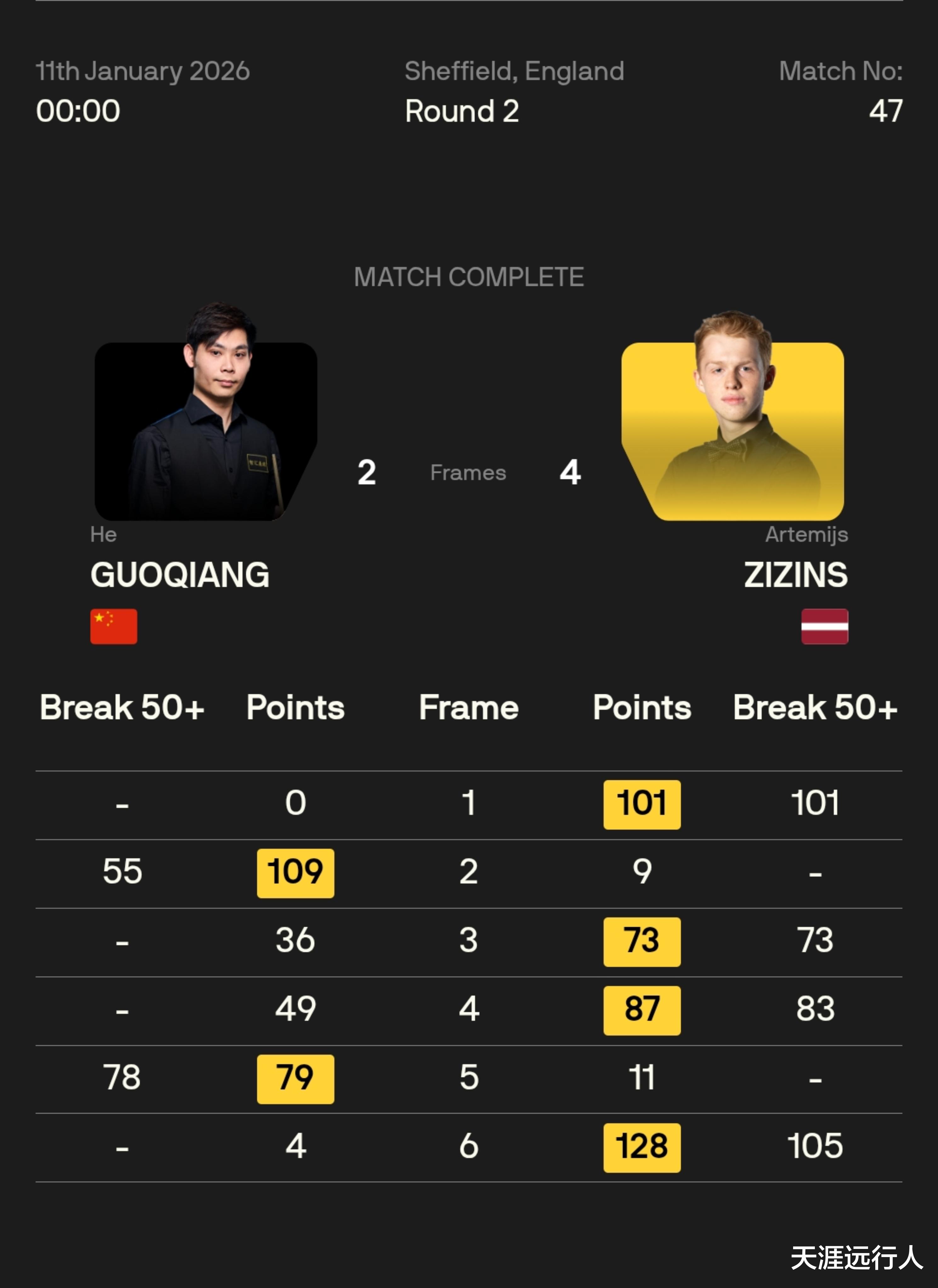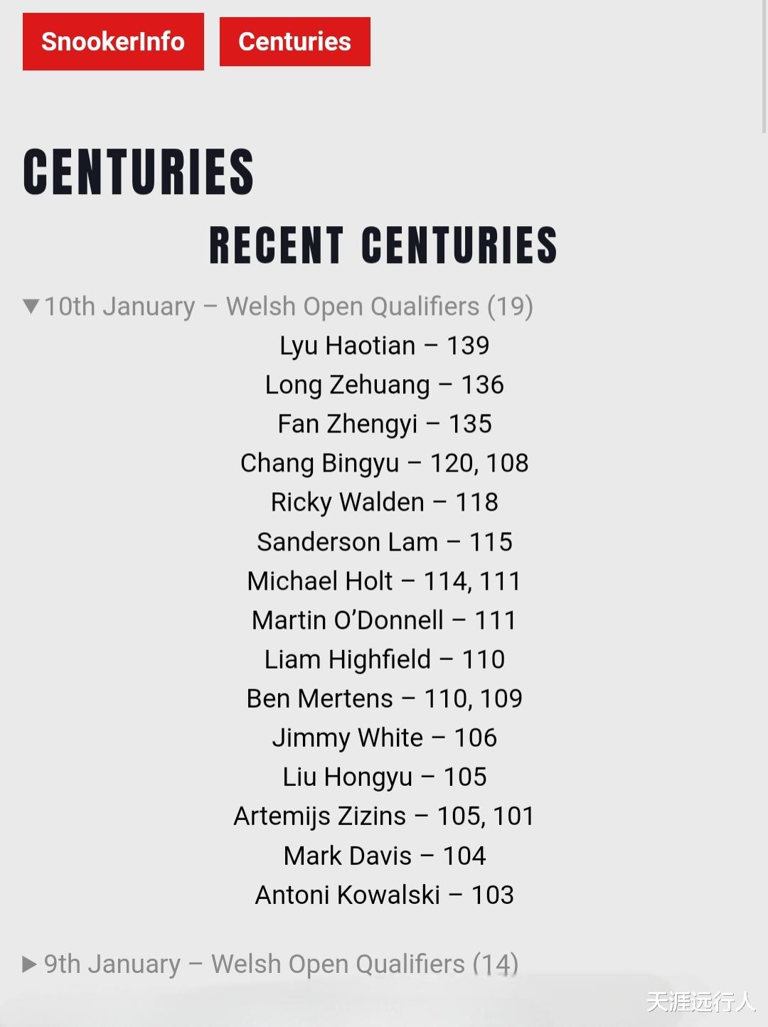 这个比赛日的32场比赛、64位球员共打出19杆单杆破百,其中有六位中国球员打出七杆,当日的前四杆、开赛两天来的前三杆高分,都是中国球员打出的,已经出局的吕昊天轰出的139分暂时排在单杆最高。