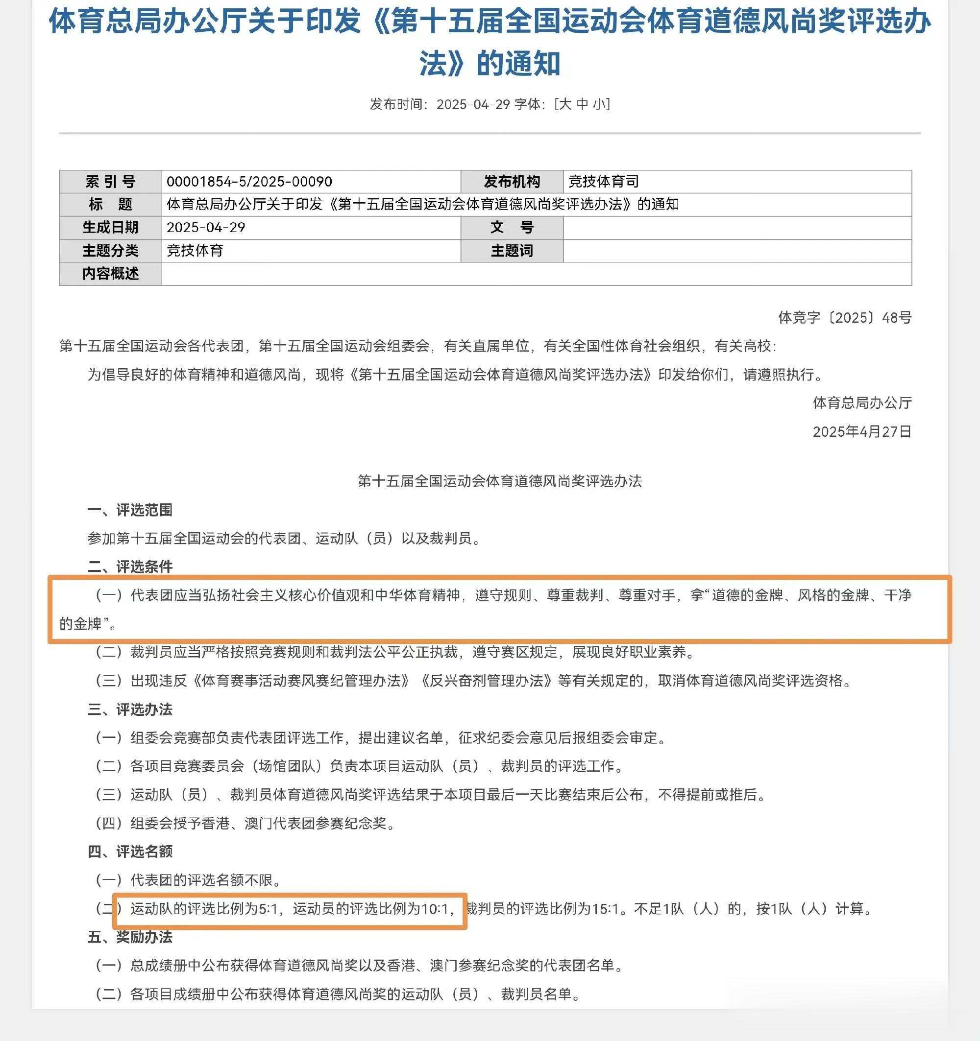 很开心,今天看到全运会除了评出比赛的金银铜牌及前八排名以外,还评出““体育道德风尚奖”。