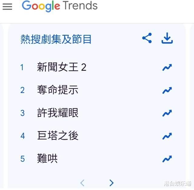 根据Google2025年度香港“十大热搜剧集及节目”榜单,TVB占据5席,其中《新闻女王2》击败一众韩剧和内地剧夺得冠军,《夺命提示》获得亚军,《巨塔之后》排名第四,人气恋综《女神配对计划》排名第六,《刑侦12》排名第七。ViuTV、HOYTV则没有任何剧集或节目上榜。