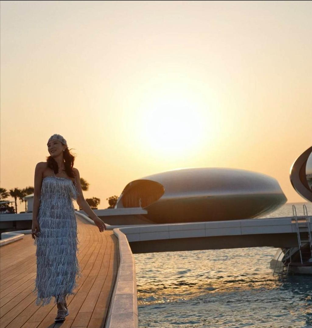 在鲁卜哈利沙漠边缘的银色太空舱酒店前,许婧身着一袭黑紫渐变吊带长裙,与身高185cm的匈牙利建筑师丈夫Tim十指紧扣。夕阳将两人的剪影镀上金边,身后停着的私人飞机与无垠沙漠构成超现实画面。最戳人心的是,当沙漠风扬起许婧的裙摆时,这位设计过迪拜未来城的精英建筑师,会自然而然地俯身为妻子抚平裙角——这个细节被镜头捕捉后,瞬间引爆社交媒体。