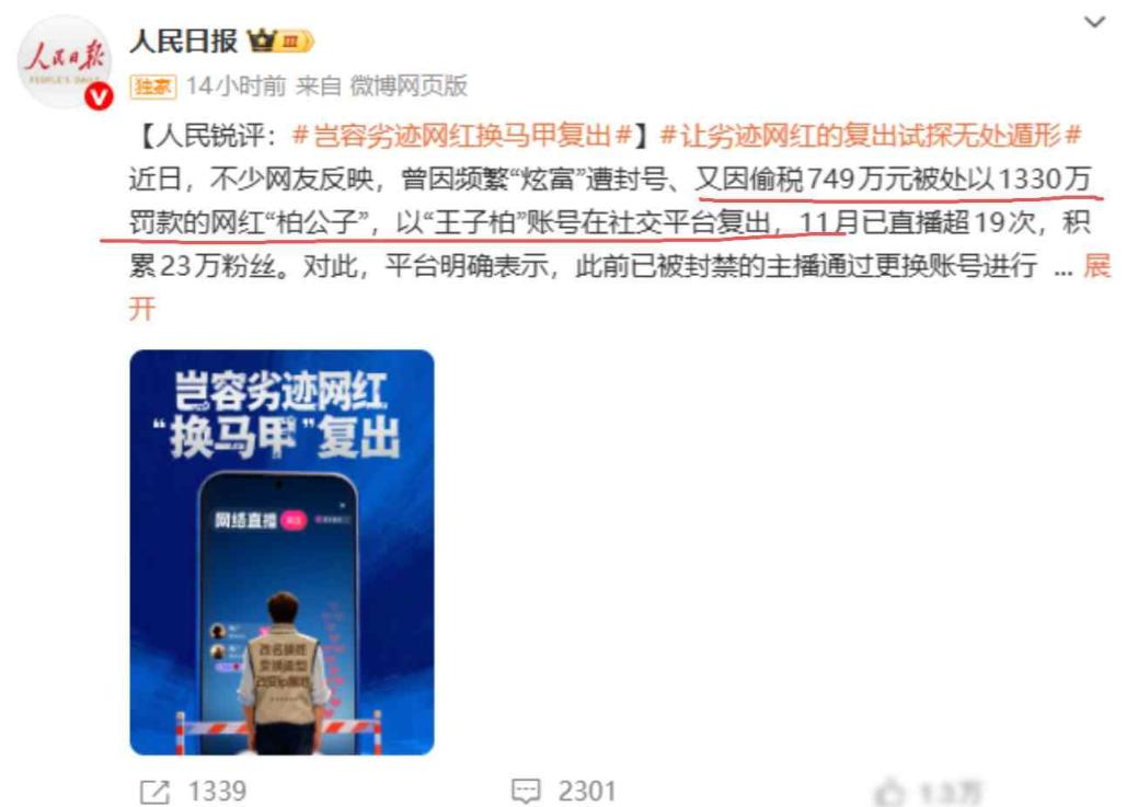 更令人拍手称快的是,《人民日报》直接发文怒批,明确指出柏公子“偷税+炫富”的行为既违法又失德,这种劣迹网红不能靠“换马甲”就洗白重来。