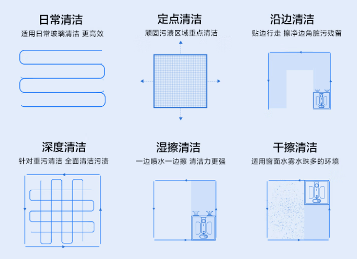 科学规划清洁路径,能大幅提升清洁效率与洁净度。优先选择“Z型”或“螺旋型”清洁模式——Z型路径适合大面积玻璃快速清扫,高效无遗漏;螺旋型路径聚焦局部顽固污渍,反复打磨更洁净。清洁玻璃边角时,建议将机器起点设在距边角10cm处,让机器自动延伸覆盖,避免边角漏擦;针对超大尺寸玻璃,可分区域清洁,既防止机器续航不足导致漏擦,也能避免重复擦拭浪费时间。