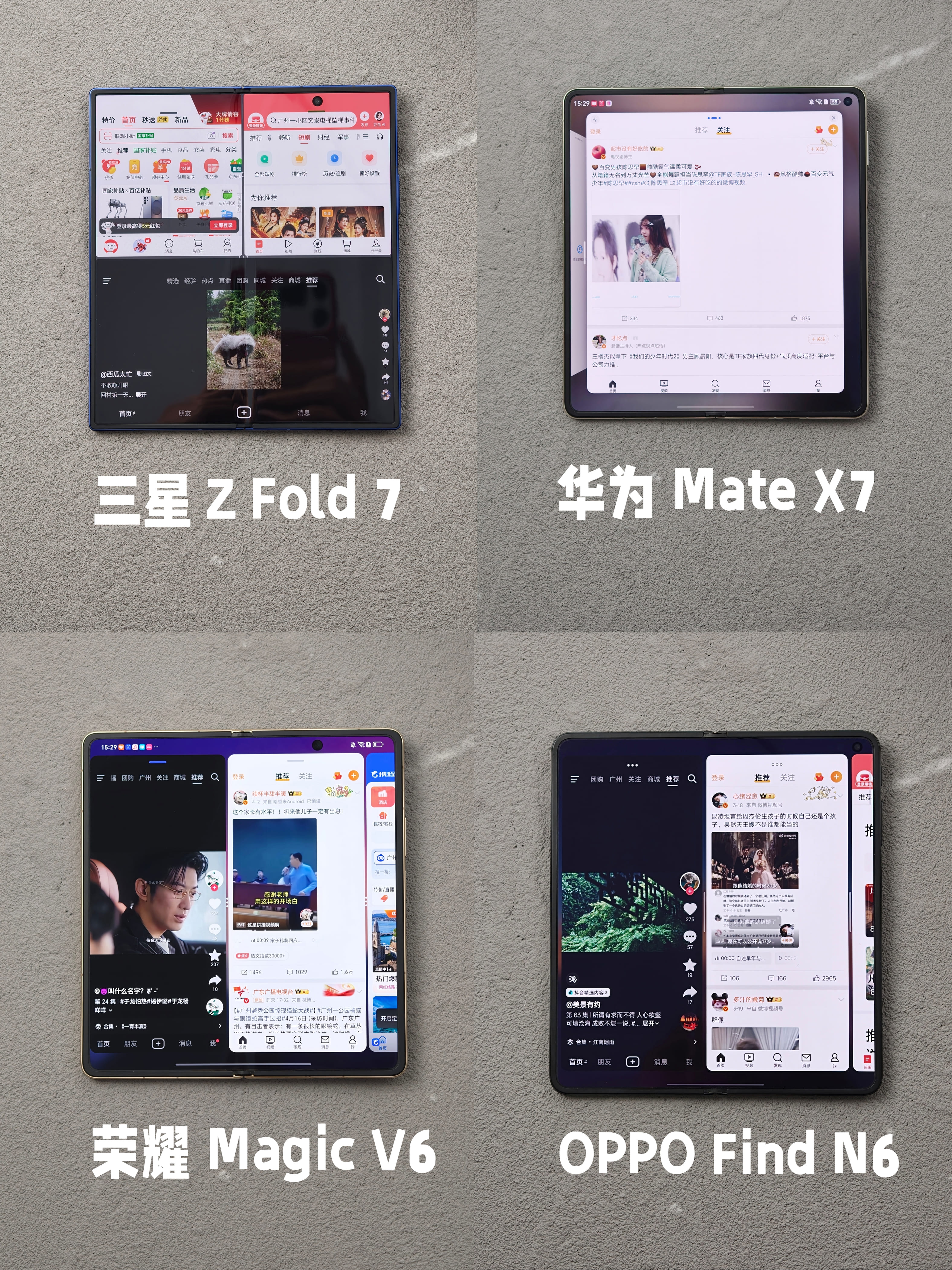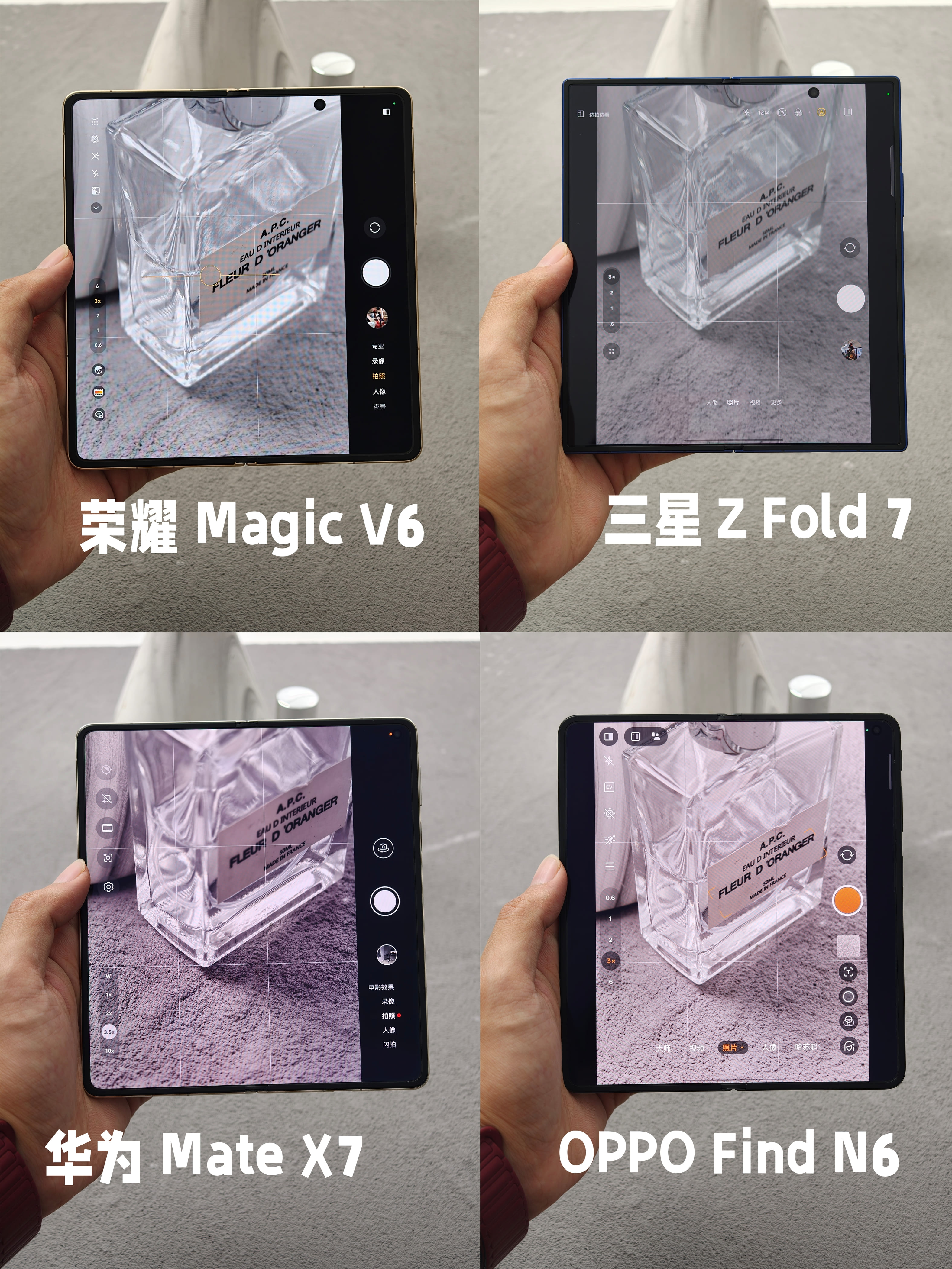 三星 Z Fold7的折痕也控制得不错,不再是之前那种凹槽了,只是浅浅的一道感知不强,这点升级很好。华为 Mate X7和荣耀 MagicV6的折痕属于中等水平,不过日常用完全不影响,值得一提荣耀 MagicV6的屏幕反光特别低,这点对经常出门的人来说很实用。
