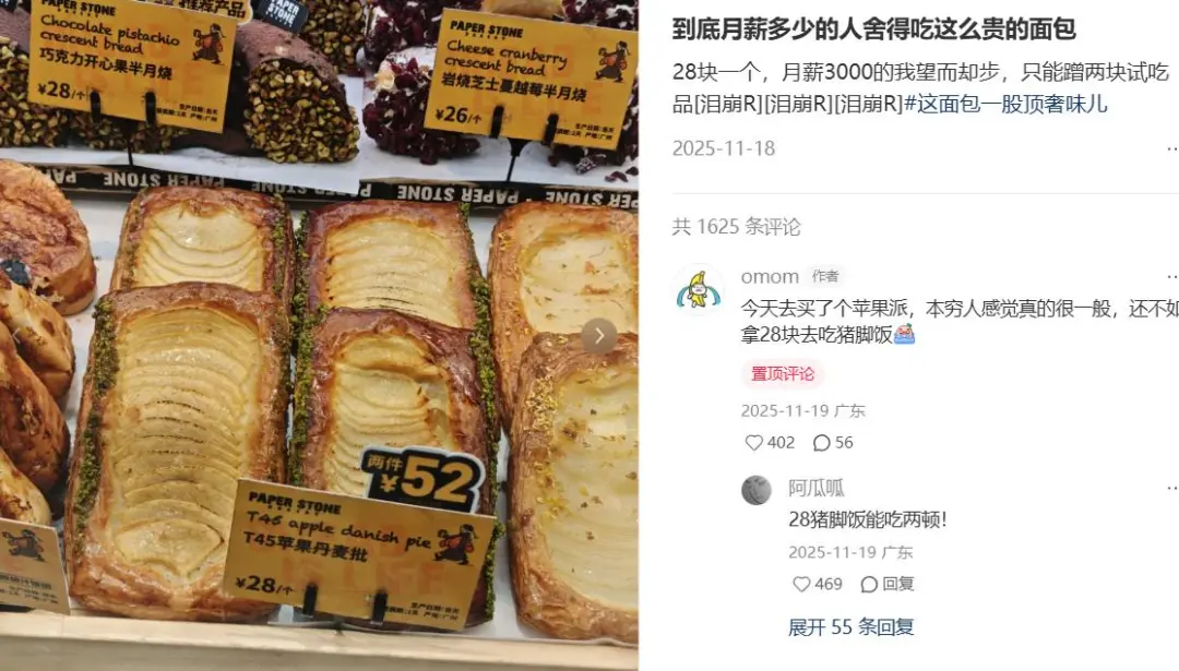 对此,有网友感叹:“到底月薪多少的人舍得吃这么贵的面包?28块一个,月薪3000的我望而却步,只能蹭两块试吃品。”另有网友表示,“28猪脚饭能吃两顿!”