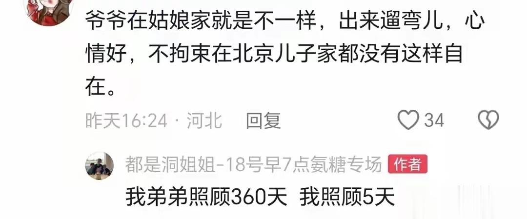 好些网友都看在眼里,说父母在女儿家舒心,不过洞姐也实诚地回应,弟弟夫妇照顾老人360天,自己照顾5天,这不是一个层面的问题,这一来一去的分寸,确实每家都有明里暗里的平衡,谁都知道,归根结底,还是谁心里装着谁。