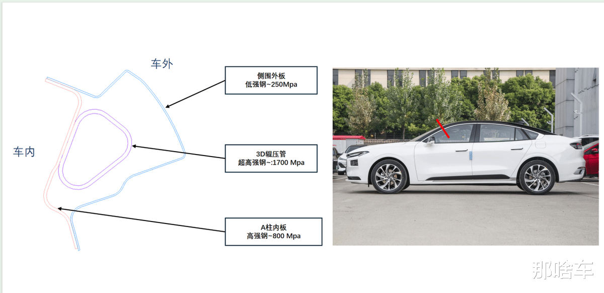 A柱采用独特的三层复合结构:1700MPa+800MPa+250MPa钢材组合,在遭受剧烈冲击时能有效抵抗变形。